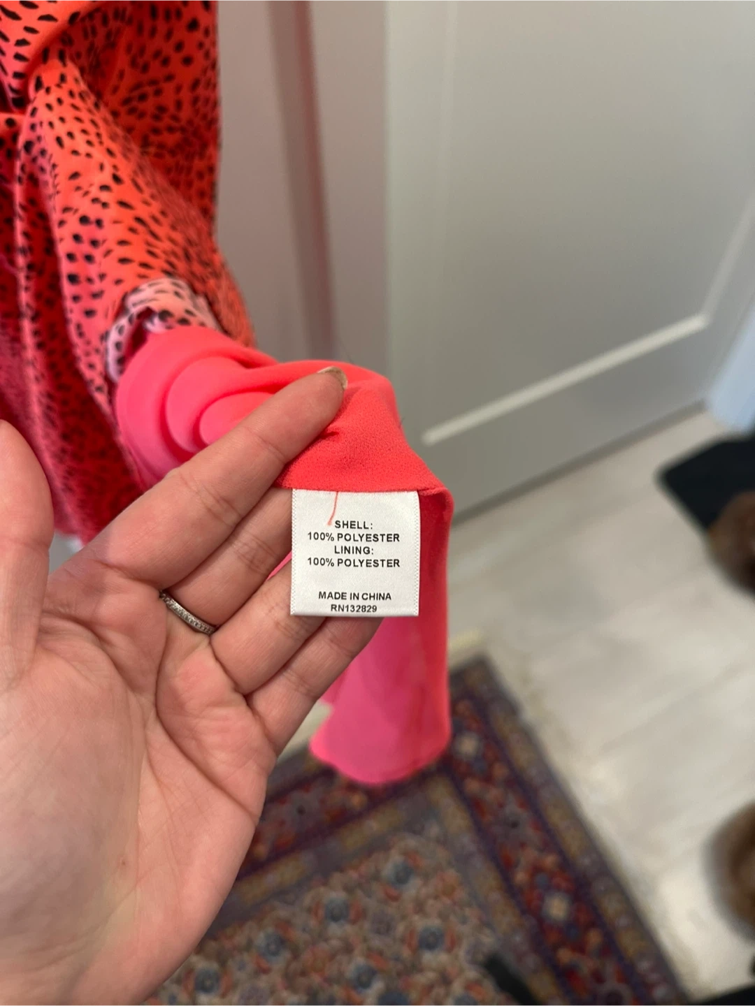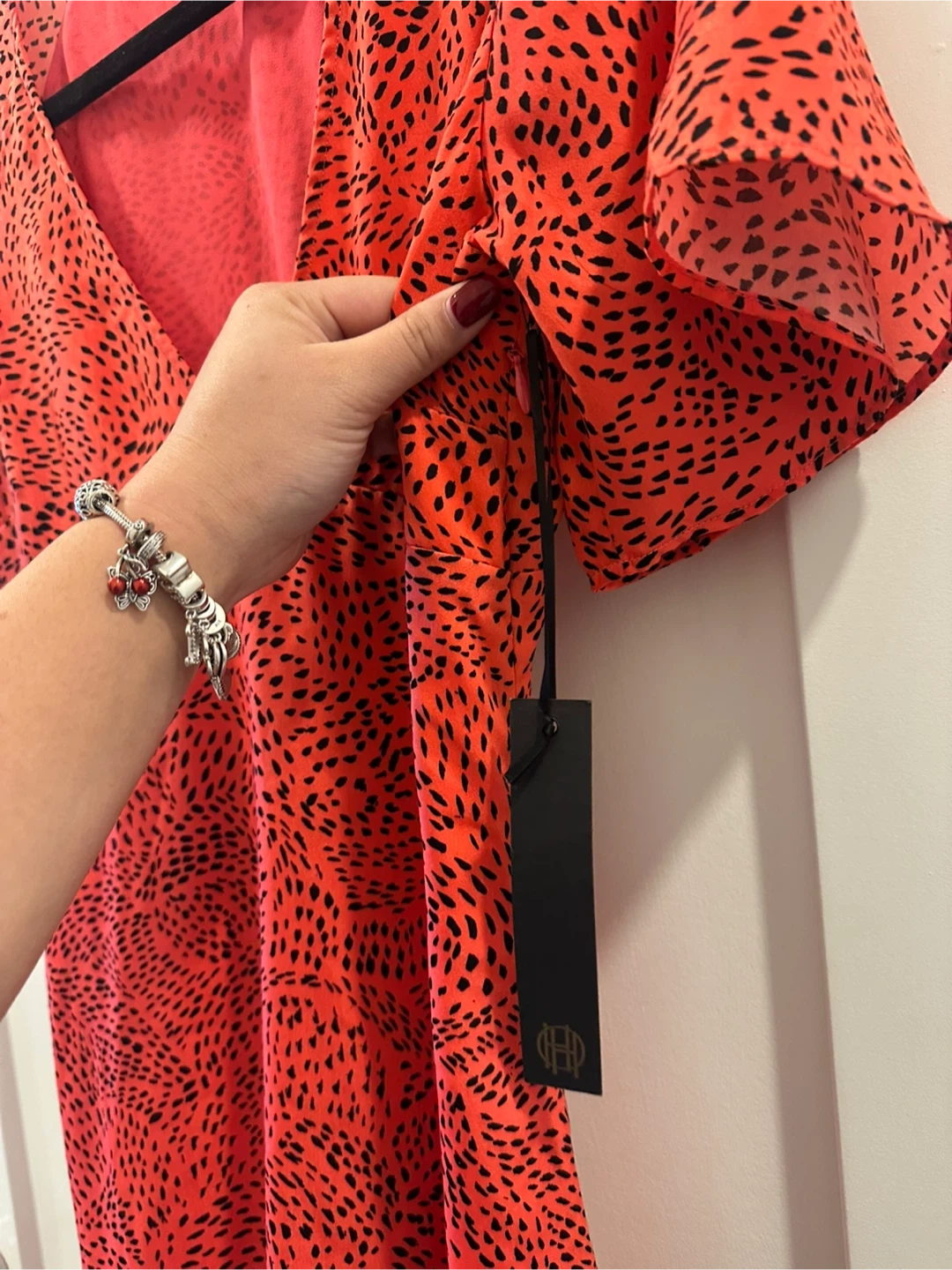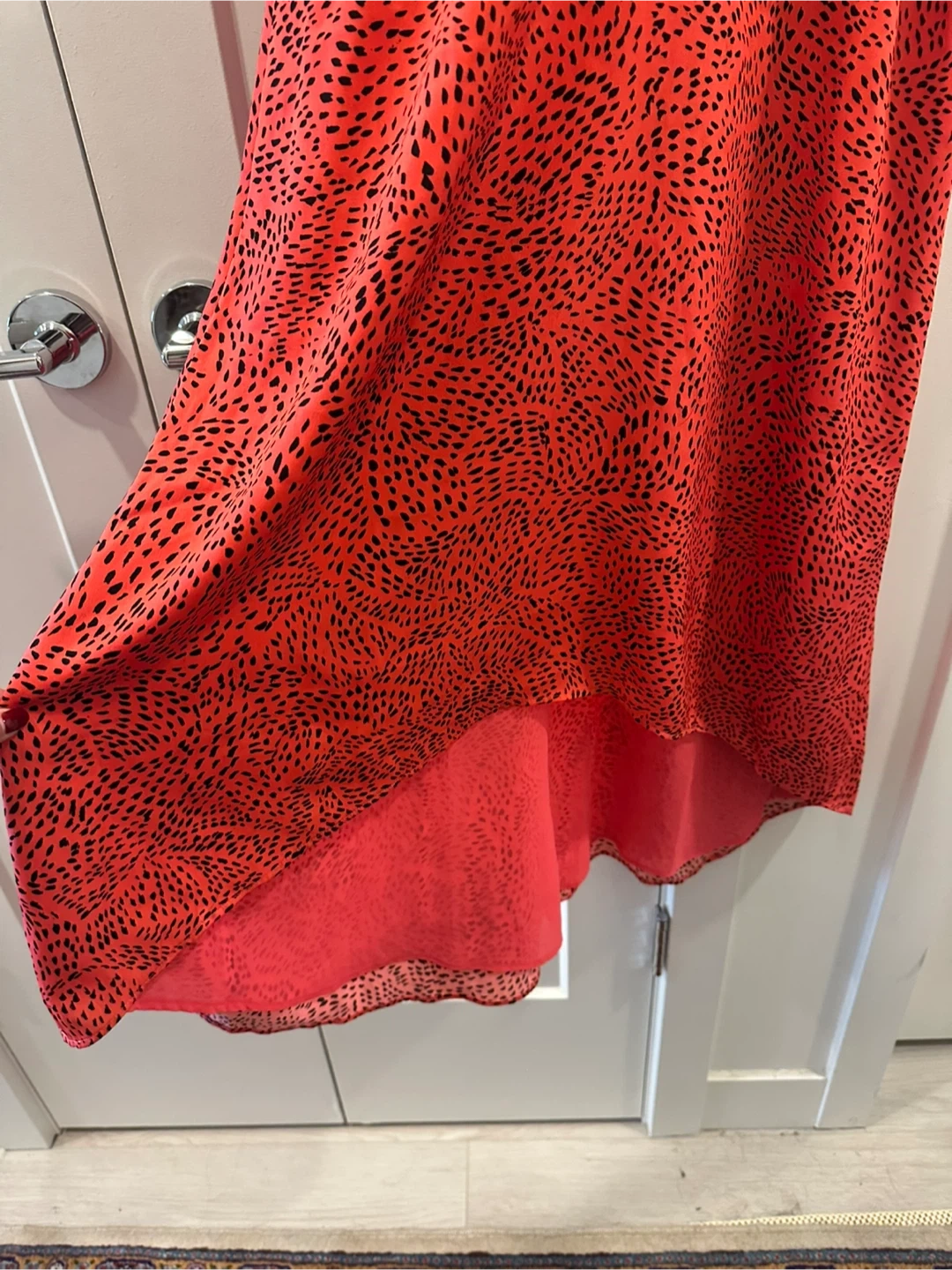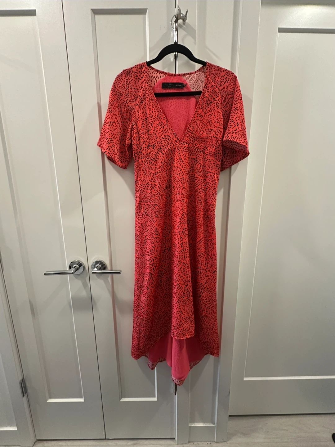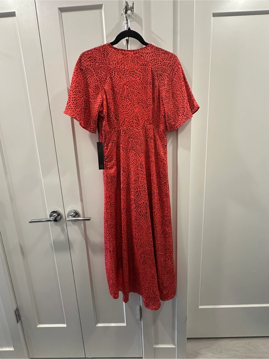 Bright red midi dress with a black abstract print. It features a V-neckline and short flutter sleeves. The hemline is asymmetrical and layered.