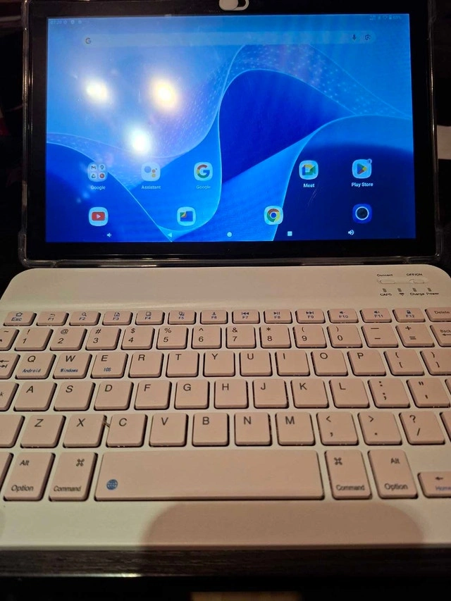 Teclast P30T Android tablet with a 10.1 Inch IPS display (1280x800 resolution). It has a Unisoc T606 Octa-Core Processor, 4GB RAM, and 128GB of storage, expandable via microSD. Features WIFI 6, a 6000mAh battery, a 5MP rear camera, and a 2MP front camera. Comes with a pink keyboard, tablet sleeve, stylus, mouse, and mouse pad. Still works perfectly fine. I used this for school and drawing and it worked great. Cash and cashless payments are accepted. Curbside pickup is available.