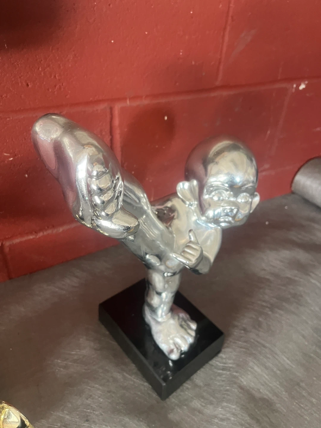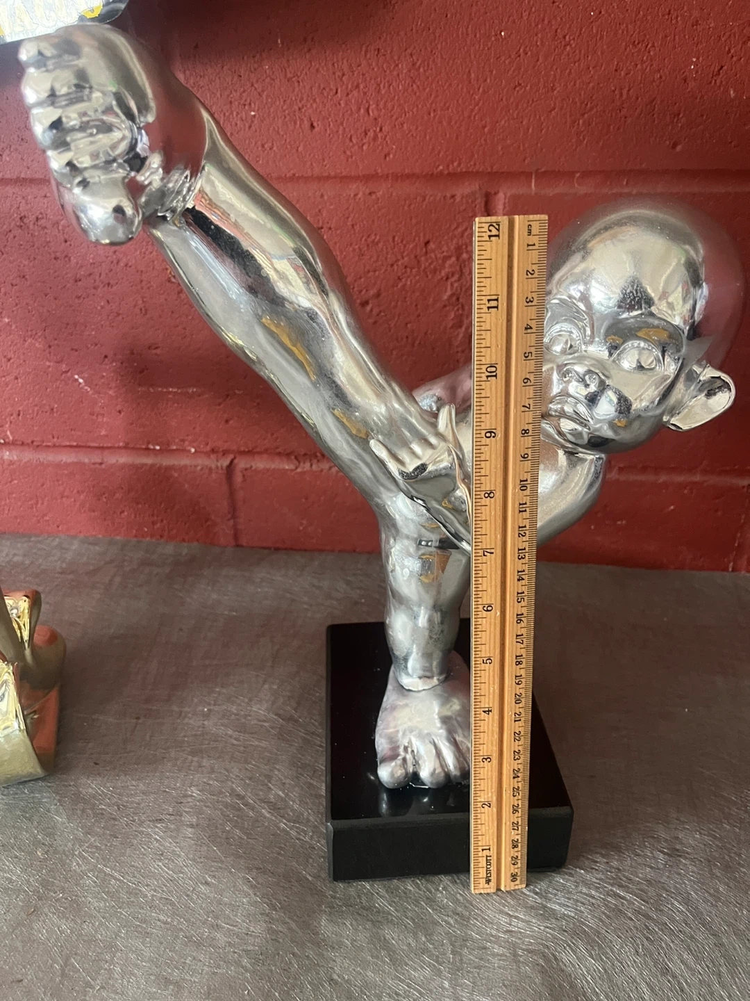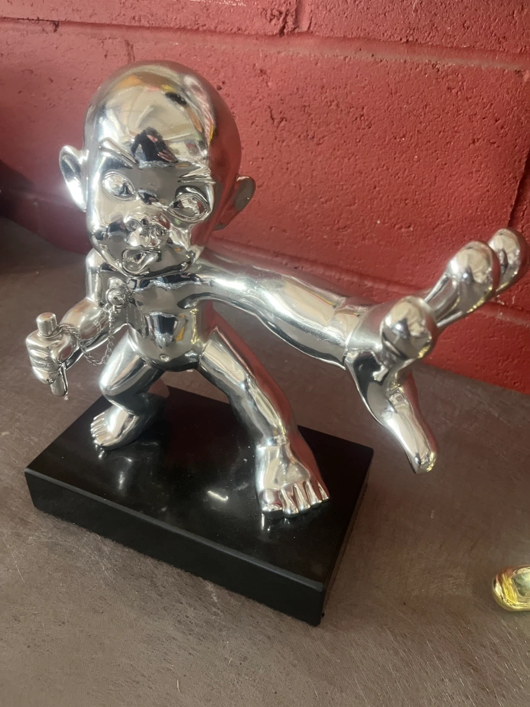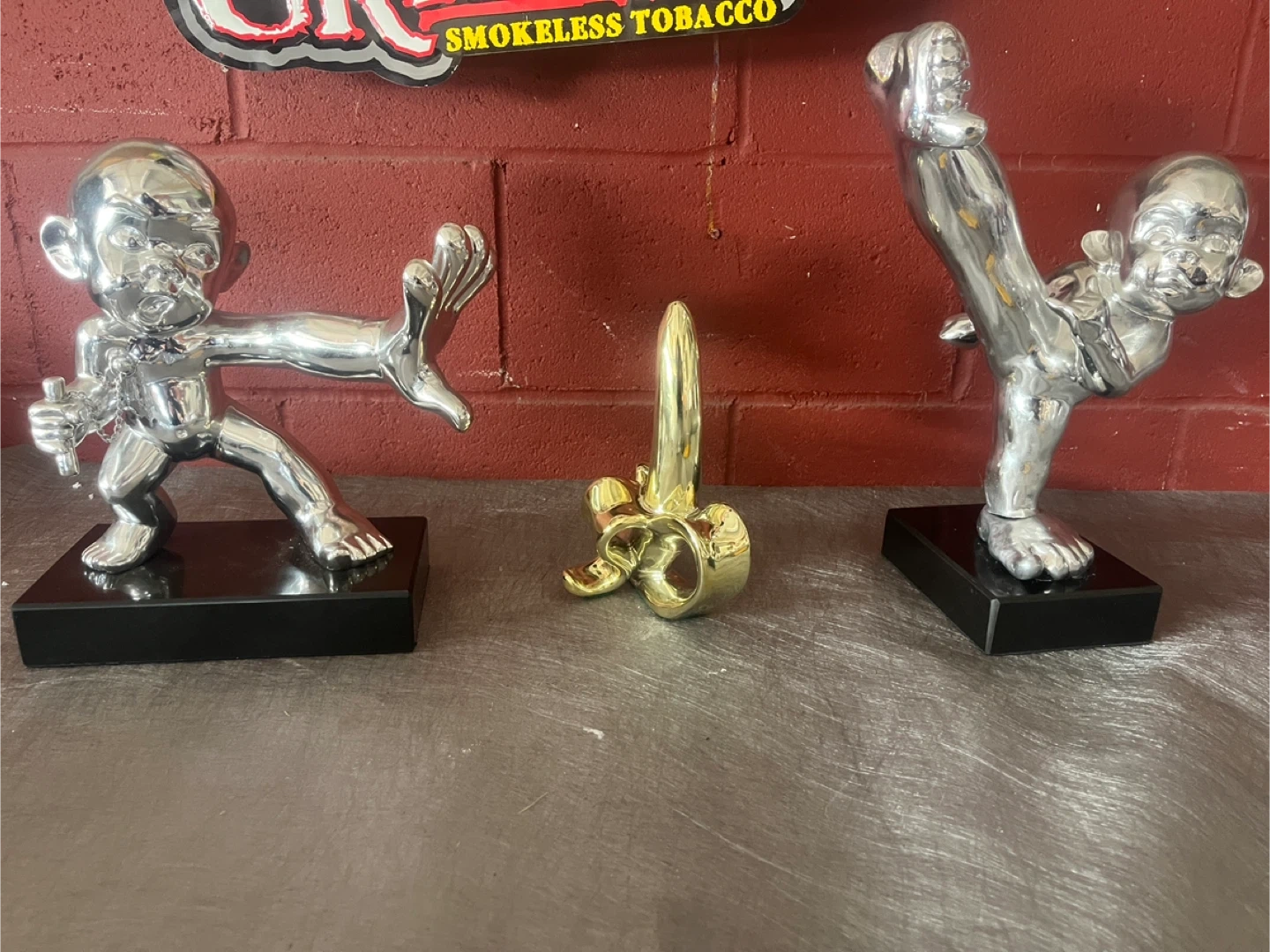 Art meets comedy in these one of a kind statues depicting two silver baby monkeys fighting for gold banana.