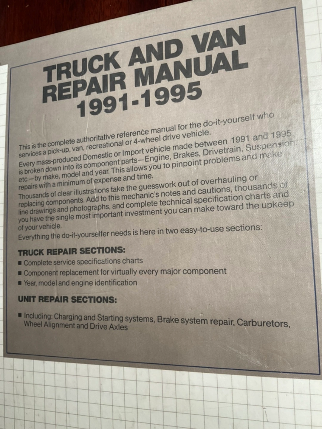 91-95 TRUCK & VAN CHILTONS MANUAL #2911 , Canadian & U.S. Models, hardcover, 3” thick, loaded with diagrams & information etc. $50. Pick up in