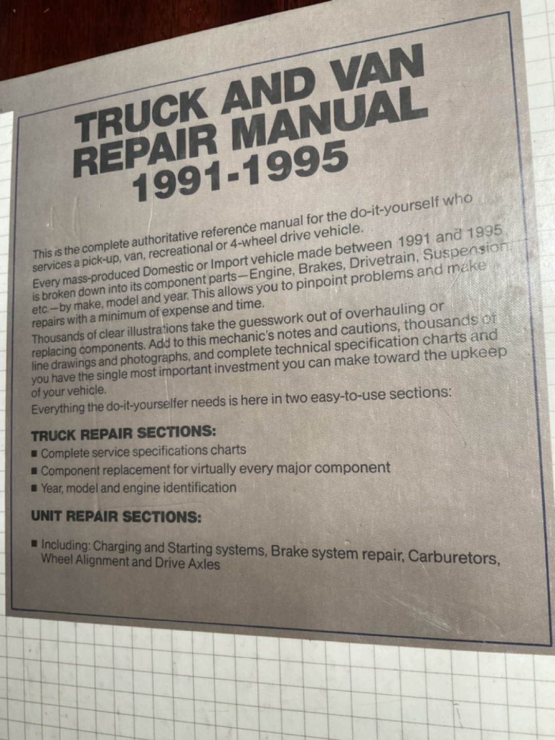 91-95 TRUCK & VAN CHILTONS MANUAL #2911 , Canadian & U.S. Models, hardcover, 3” thick, loaded with diagrams & information etc. $50. Pick up in