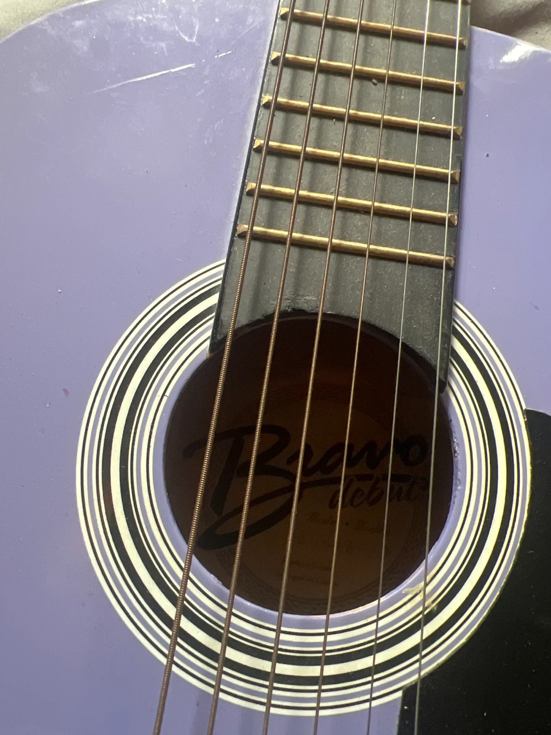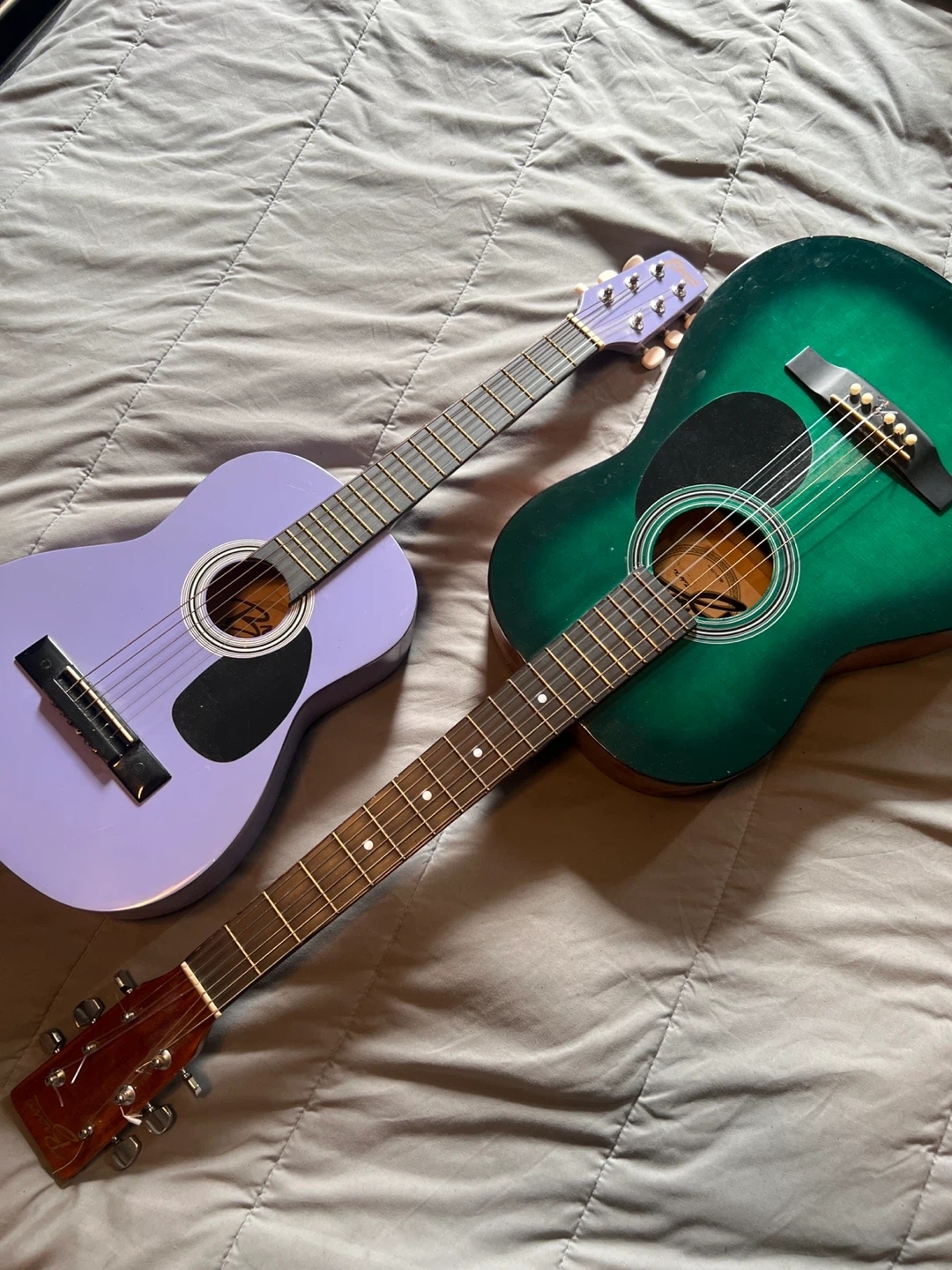 Two Bravo acoustic guitars, one purple and one green. These are great starter instruments for learning to play! For your aspiring kids. Both for $80 cash.