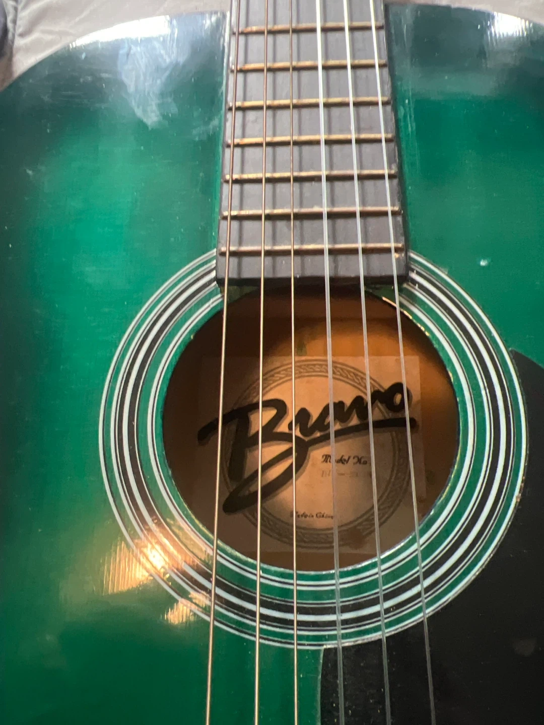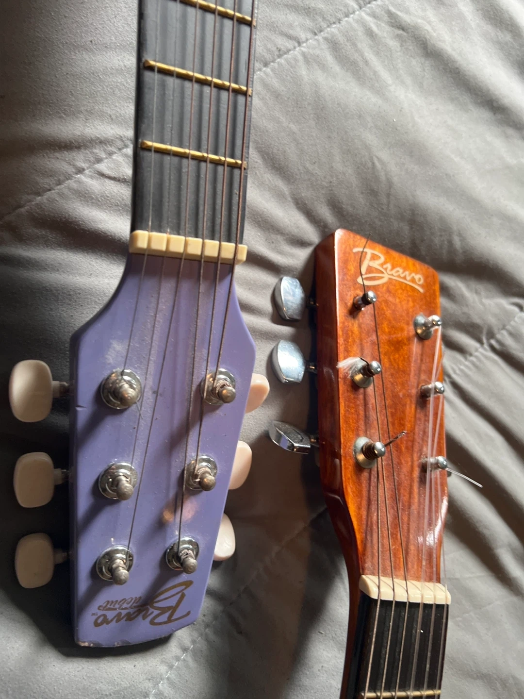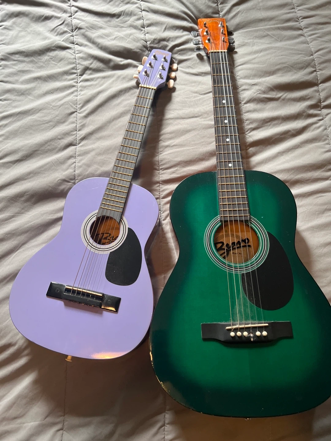 Two Bravo acoustic guitars, one purple and one green. These are great starter instruments for learning to play! For your aspiring kids. Both for $80 cash.