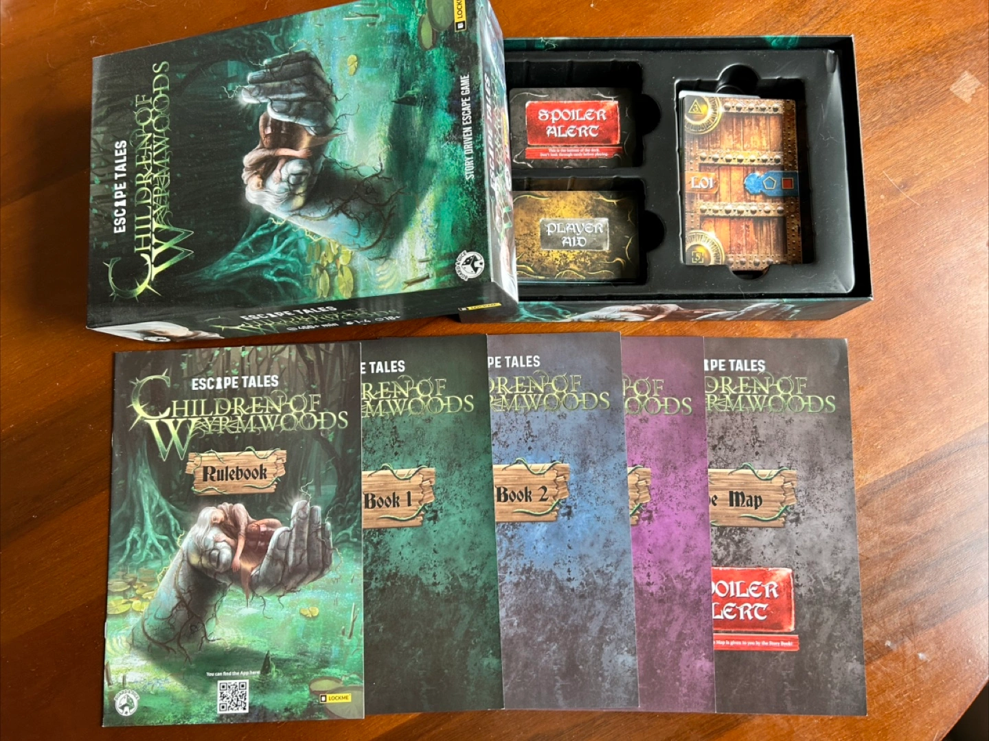 Selling the Escape Tales: Children of Wyrmwoods story-driven escape game! This game is by Lockme. Includes the box, rulebook, all 3 story books, and game map.