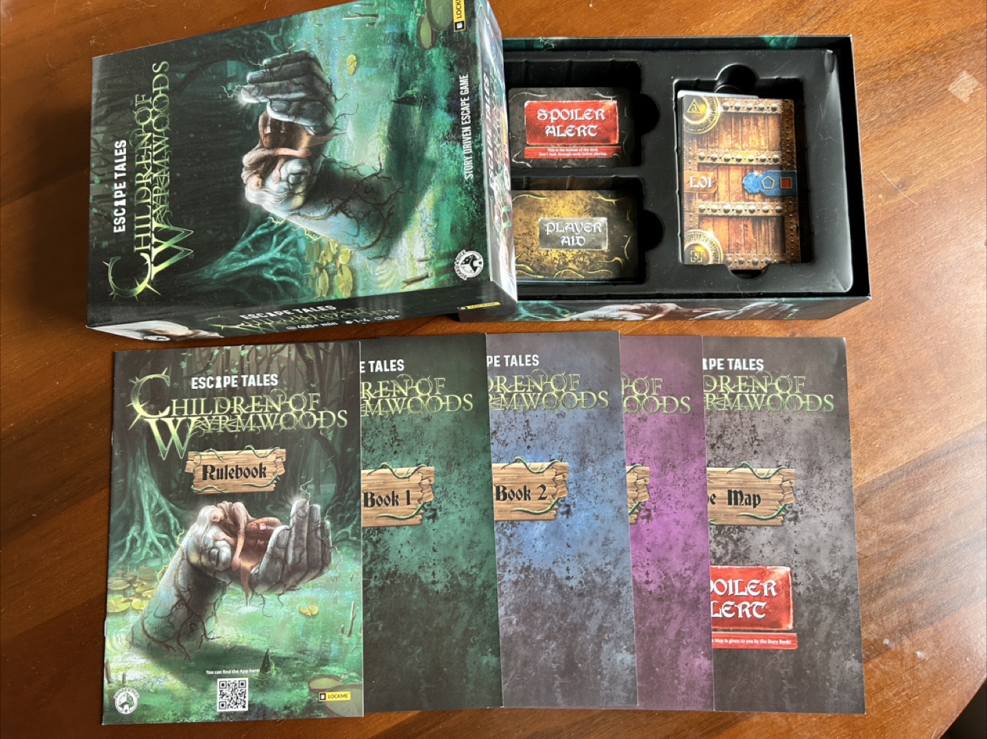 Selling the Escape Tales: Children of Wyrmwoods story-driven escape game! This game is by Lockme. Includes the box, rulebook, all 3 story books, and game map.