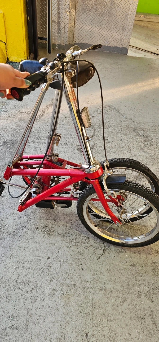 This is a red folding bicycle with easy ride to travel with. It has a chrome frame and handlebars. Folds for easy storage and transport!