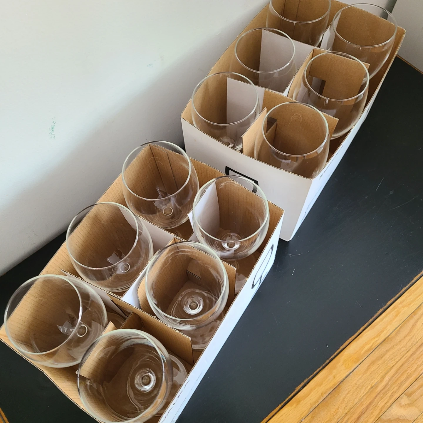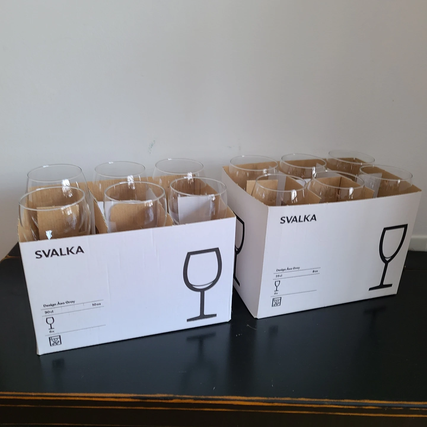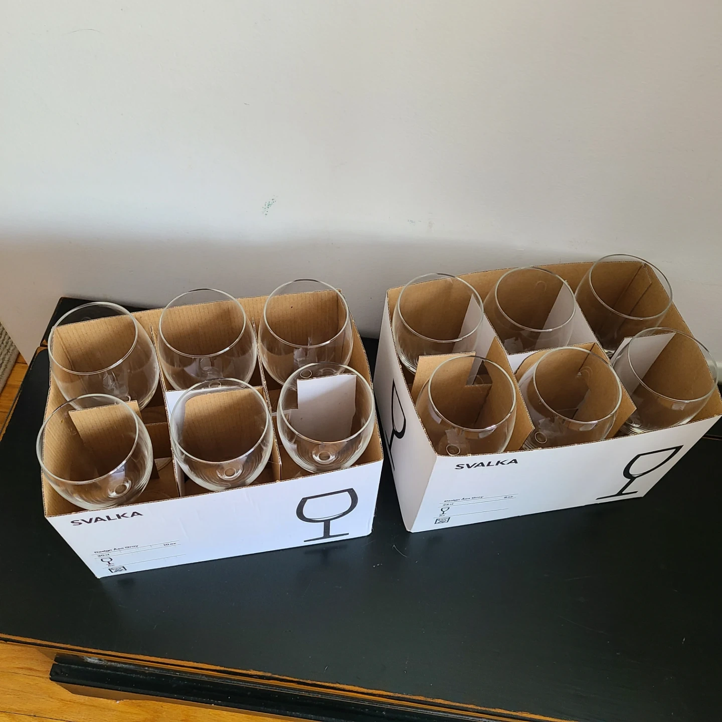This is a set of 12 IKEA SVALKA wine glasses. They are clear glass and come in their original packaging. Each glass holds 10 oz. These are great for everyday use or entertaining!