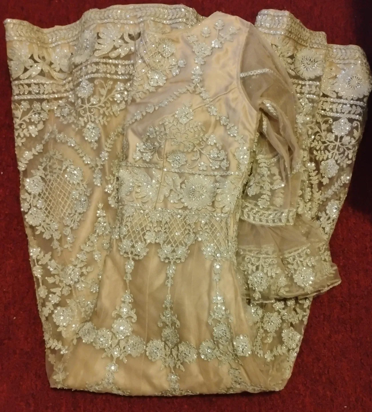 Stunning embellished champagne coloured dress with intricate beadwork and sequins. It's a beautiful piece for special occasions. Material is a mix of satin and net.