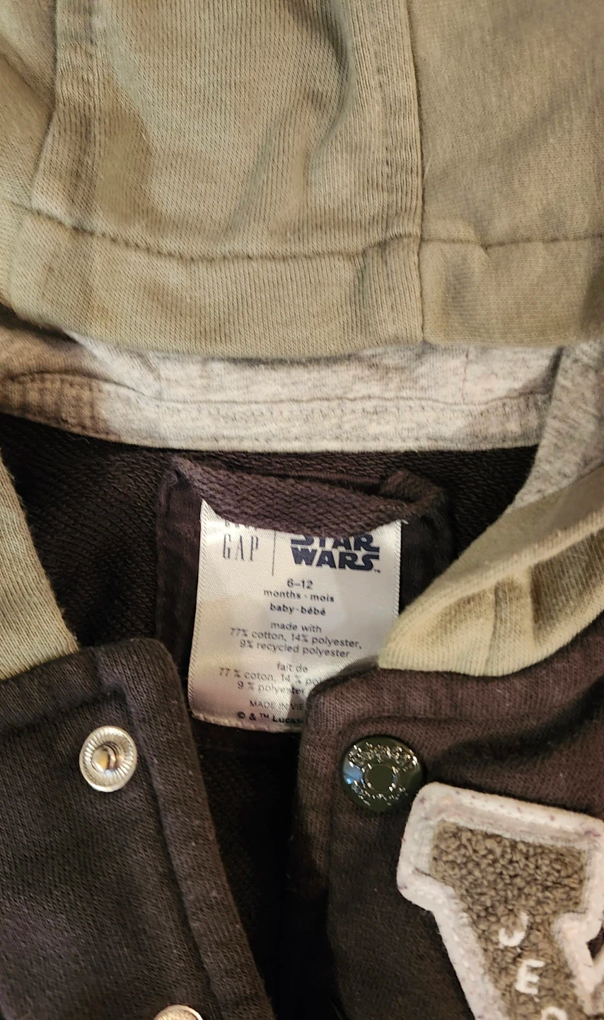 This GAP Star Wars jacket is perfect for little ones. It's made with 77% cotton and 10% recycled polyester. The hood has cute Yoda ears!