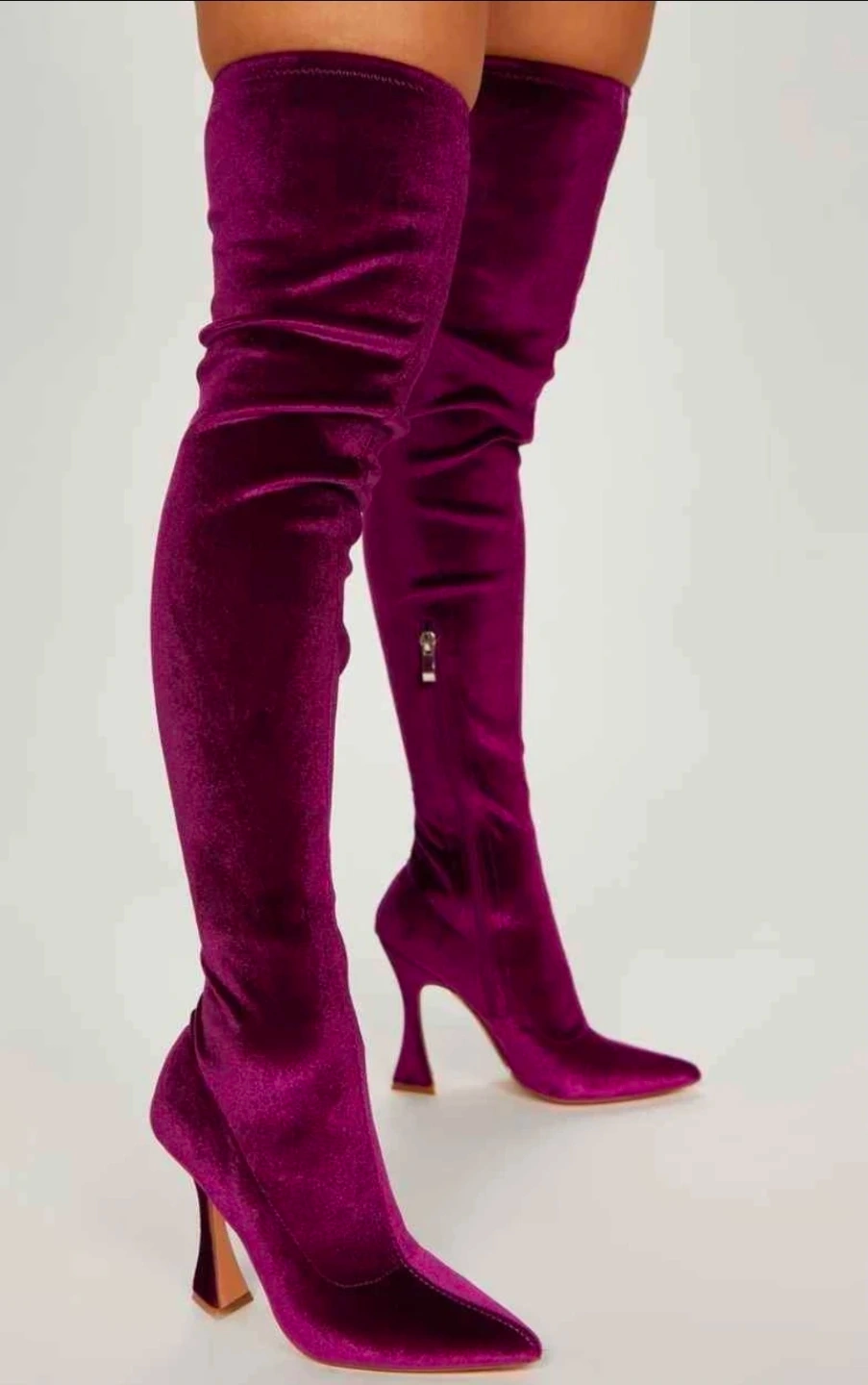 These are a stylish pair of purple velvet thigh-high boots! They have a unique heel and a zipper on the side.