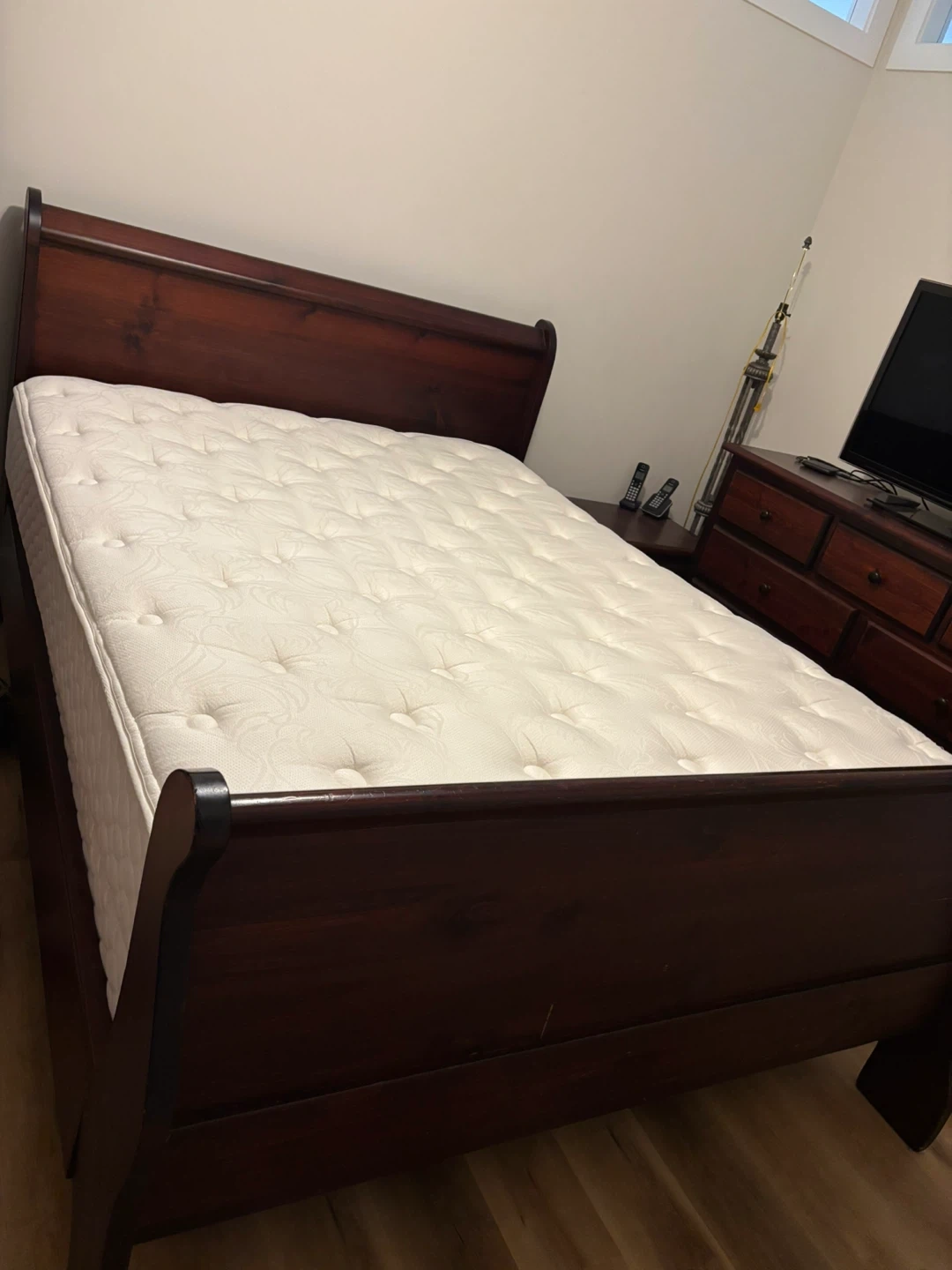 Queen size, solid pine sleigh bed, 9 drawer dresser,night stand, fat boy night stand. Queen mattress (excellent condition) with box spring.