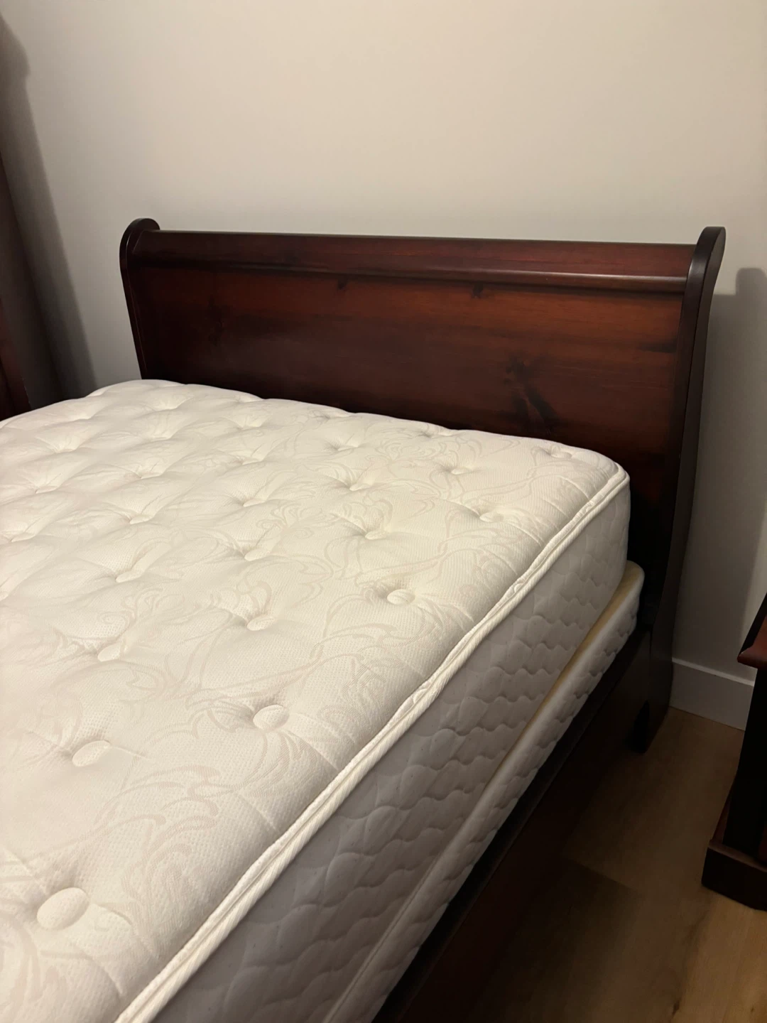 Queen size, solid pine sleigh bed, 9 drawer dresser,night stand, fat boy night stand. Queen mattress (excellent condition) with box spring.