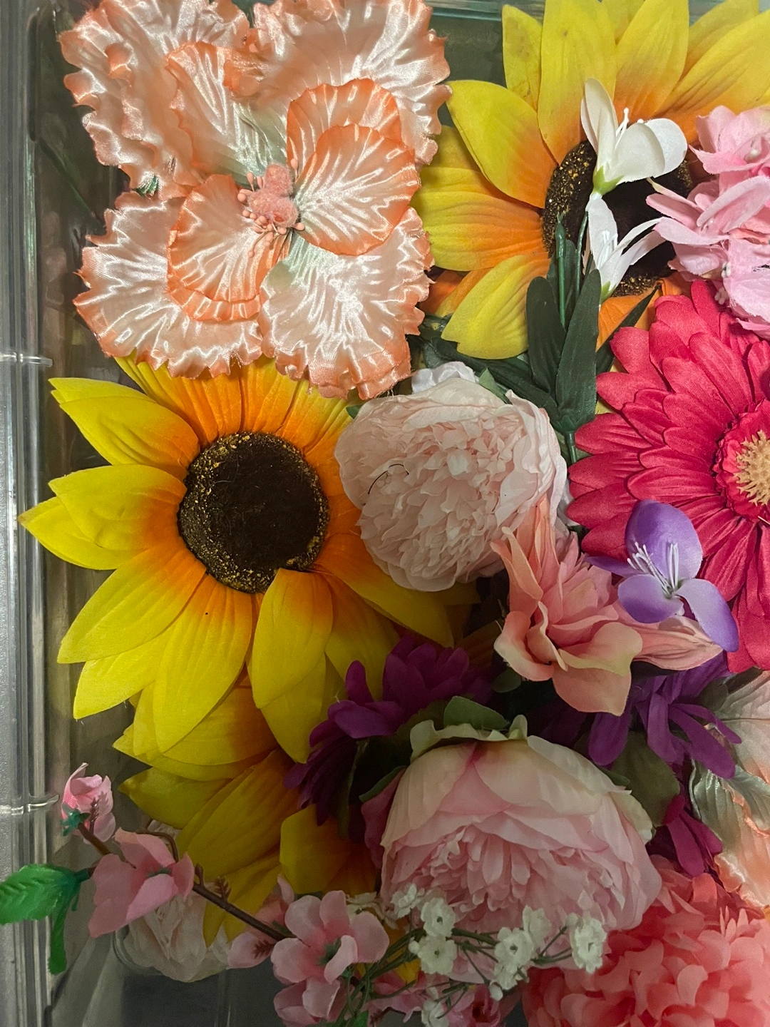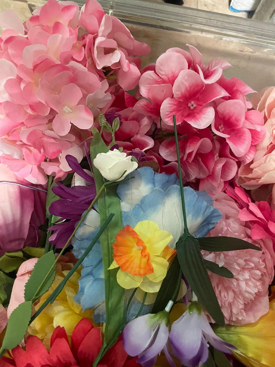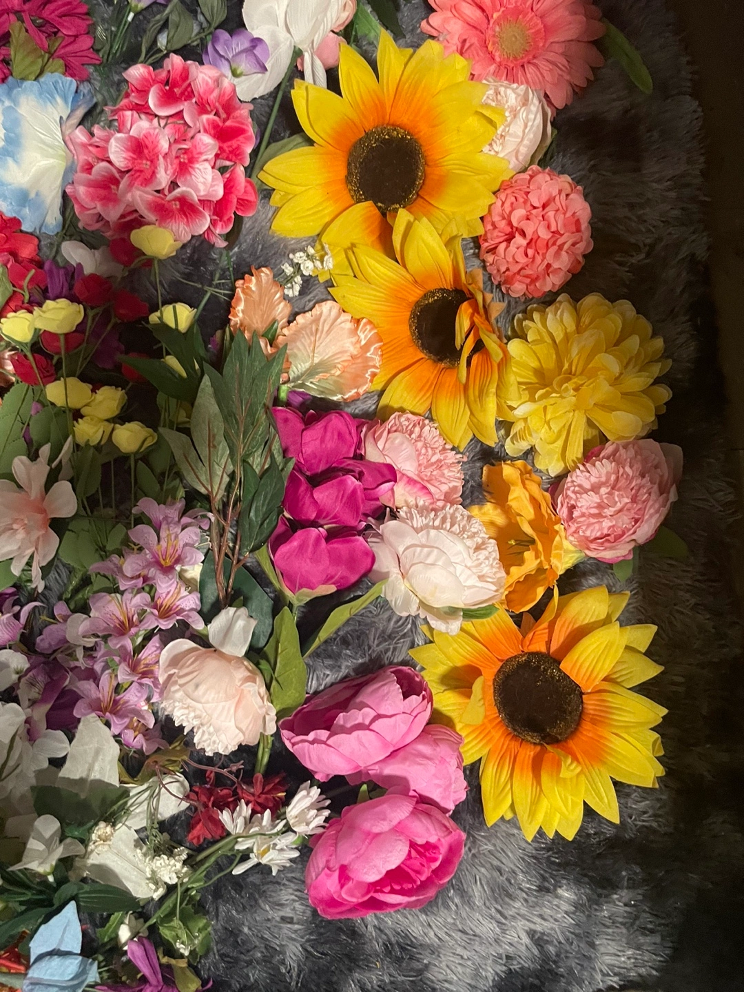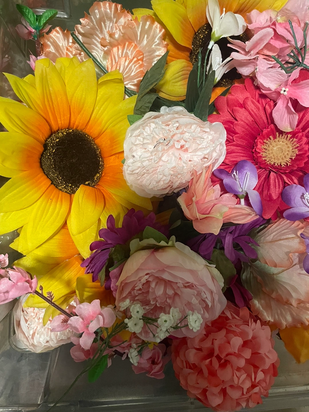Assortment of artificial flowers in a variety of colours. Includes sunflowers, peonies, cherry blossoms, roses and other blooms. Great for decorating.