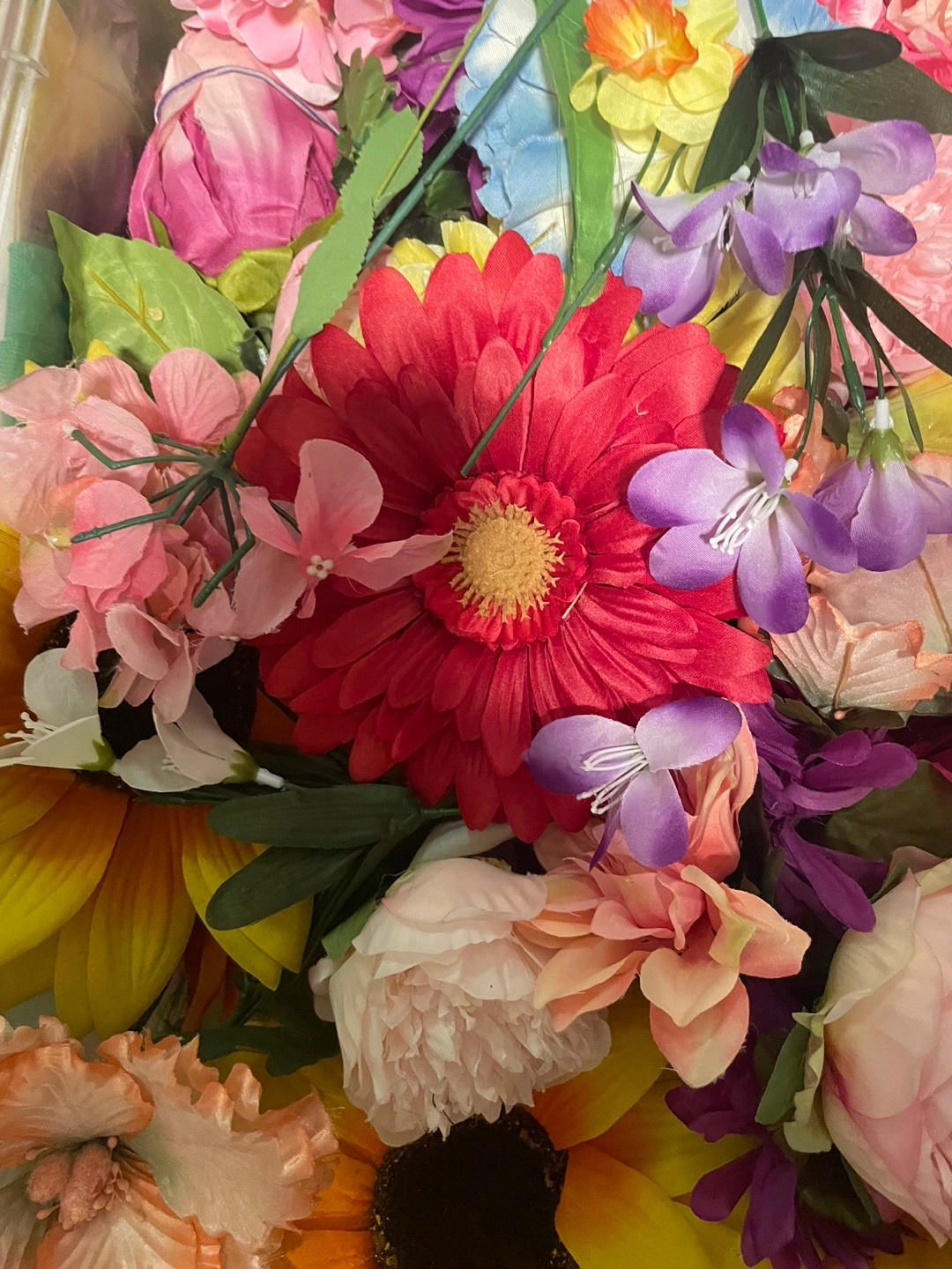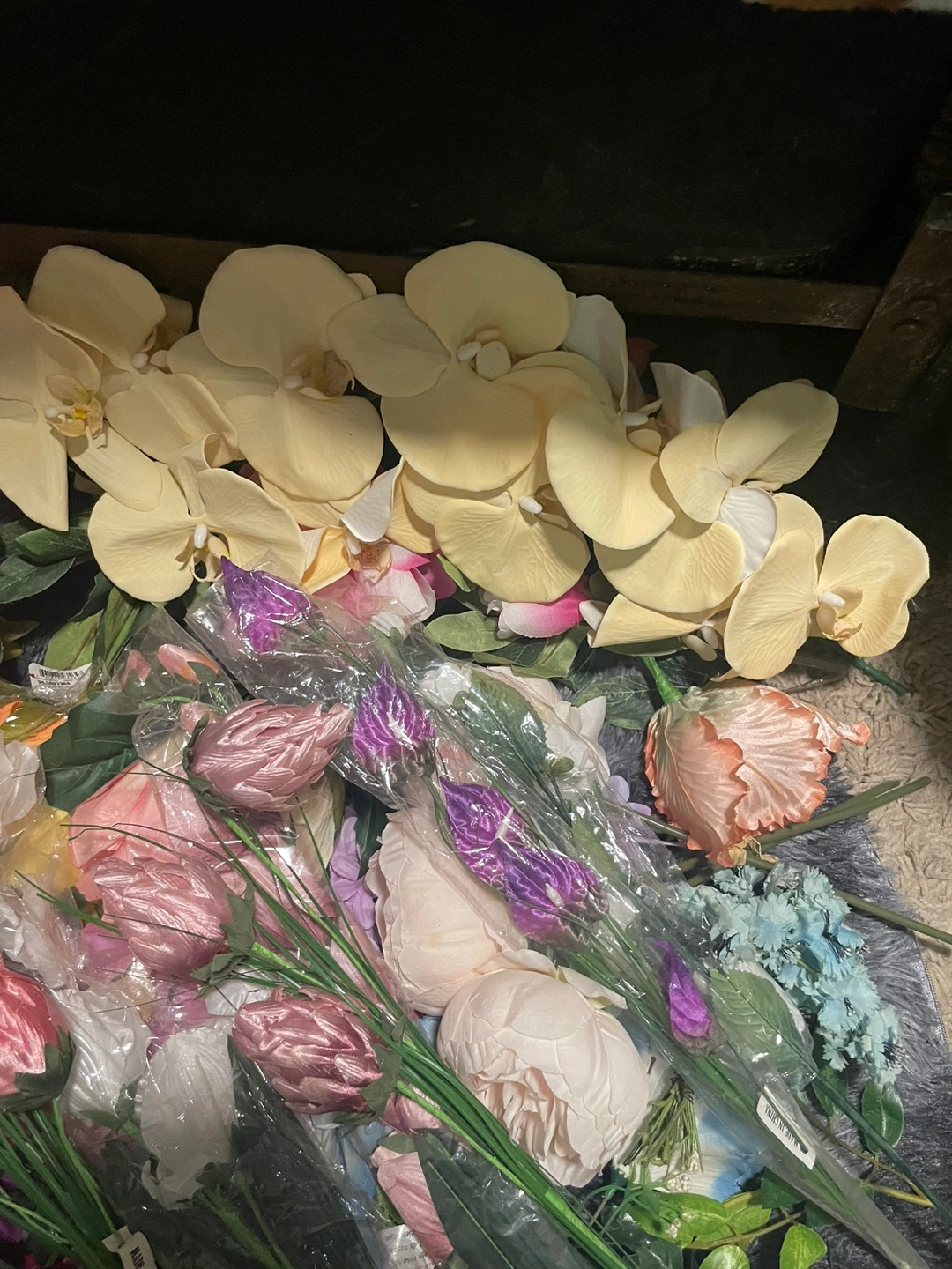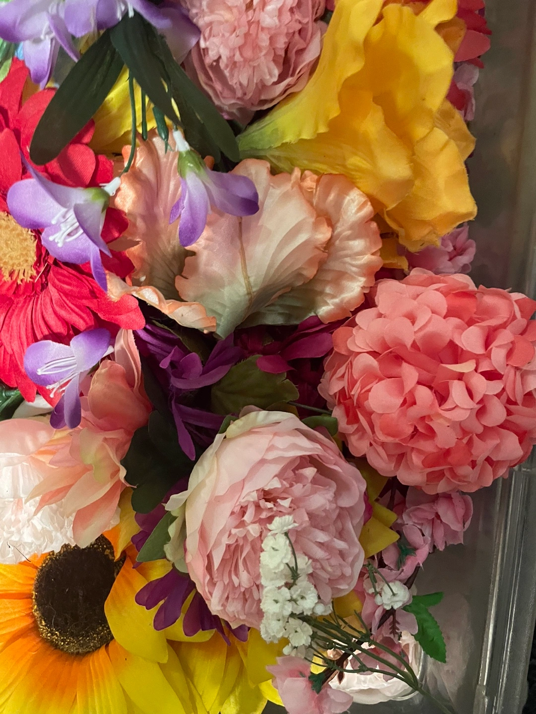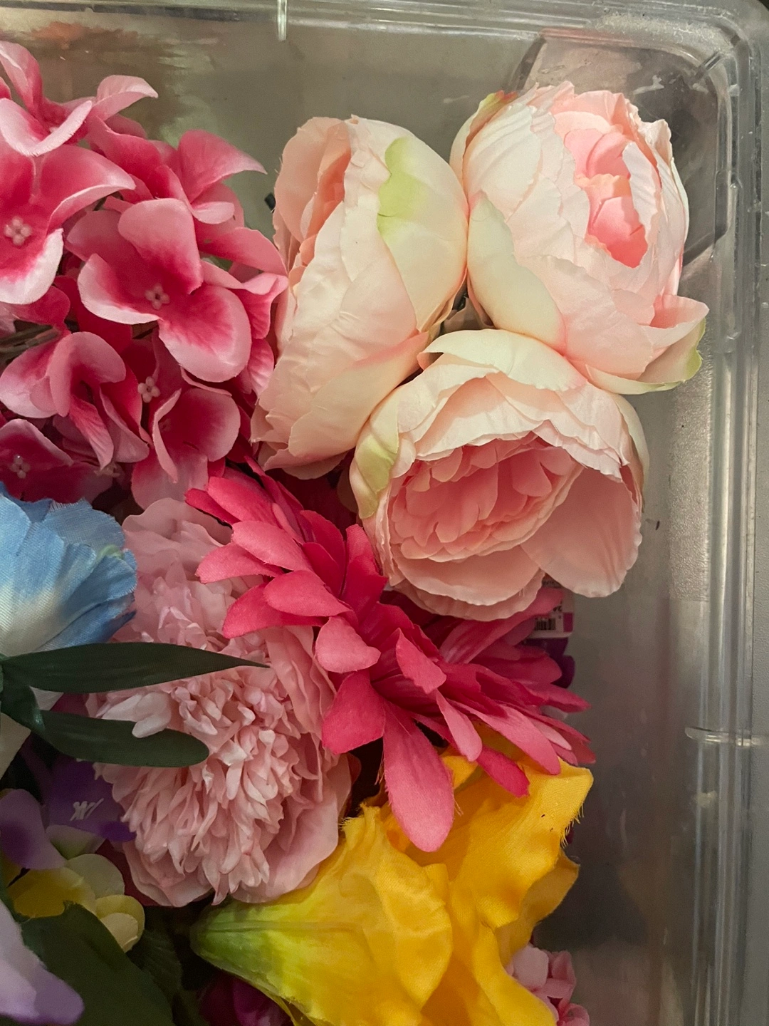 Assortment of artificial flowers in a variety of colours. Includes sunflowers, peonies, cherry blossoms, roses and other blooms. Great for decorating.