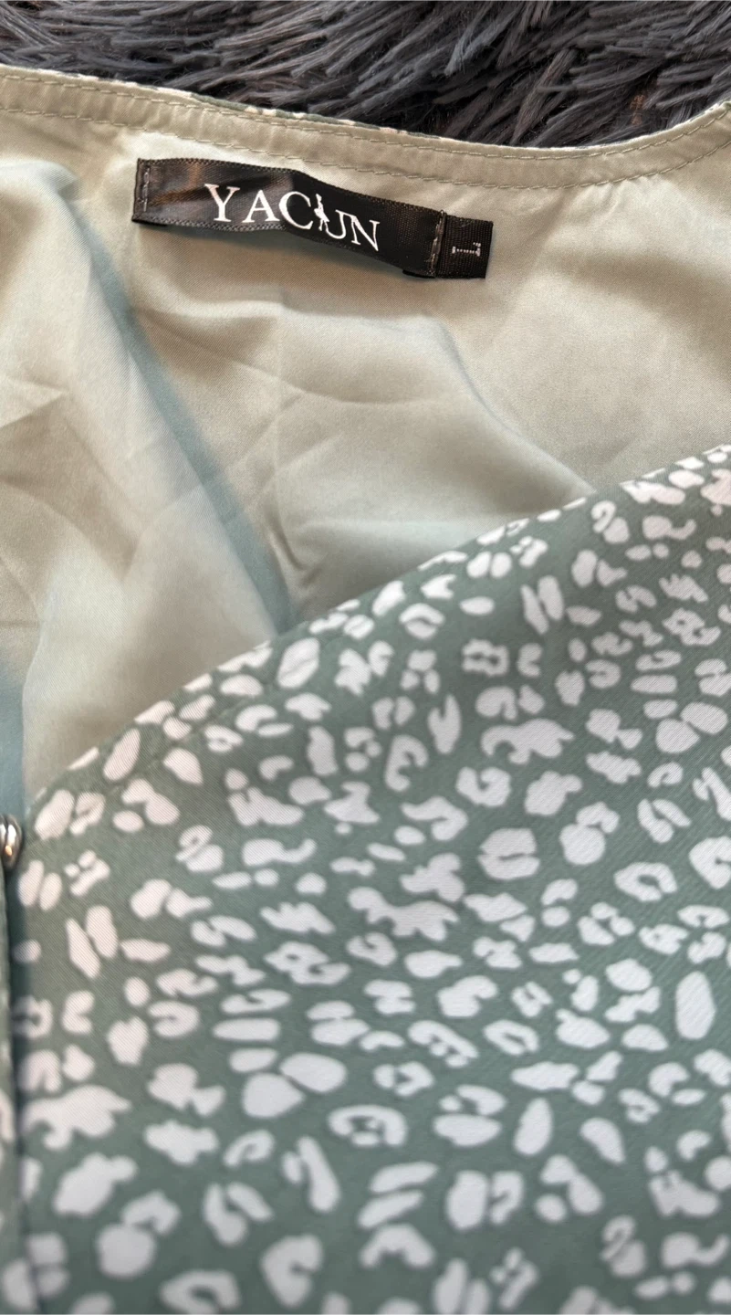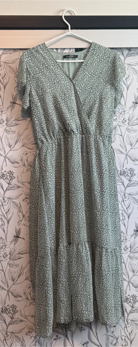 This YACUN dress features a lovely floral print. It's a size large with a flattering V-neck and elastic waist. The tiered skirt adds a nice flowy detail. Great for spring and summer occasions!