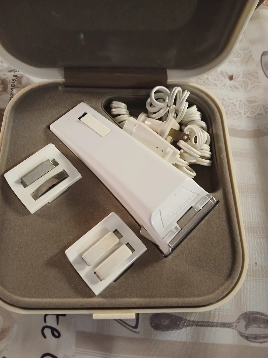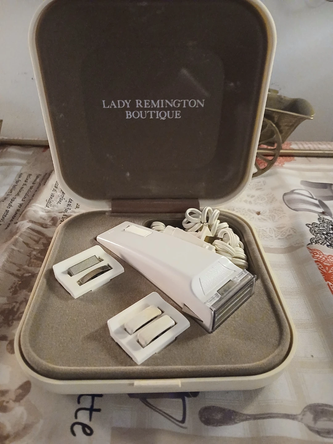 Vintage Lady Remington Boutique electric shaver with its travel case. It includes the shaver, power cord, and two attachment heads. A classic grooming tool!