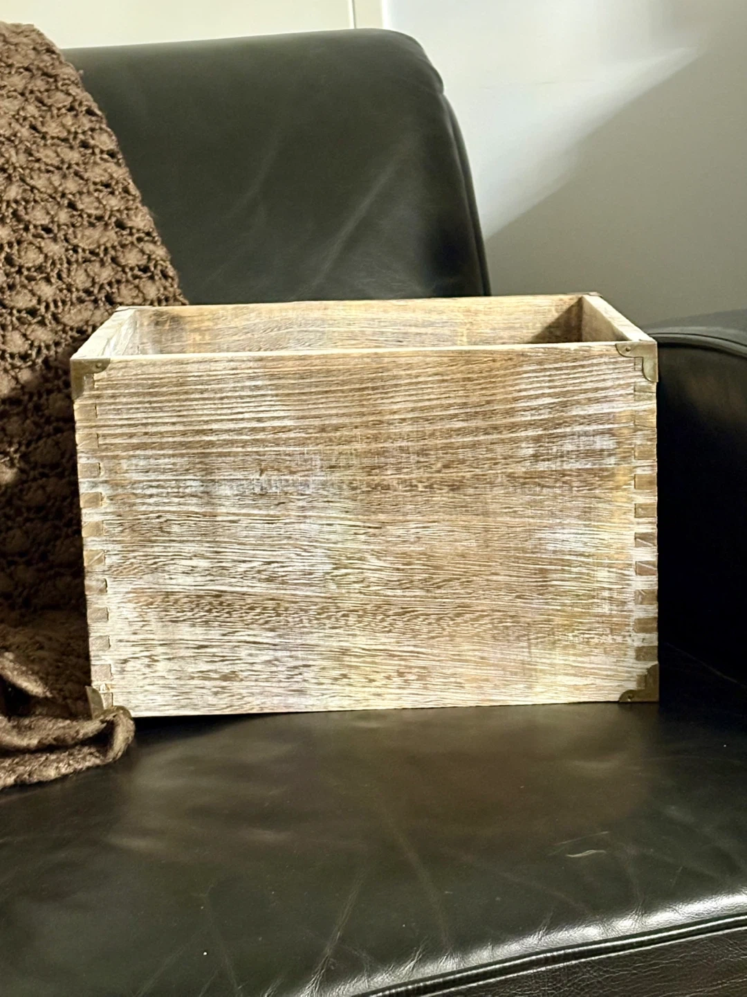 This rustic wooden crate is perfect for organizing or decorating your space. It features a distressed wood finish with metal corner accents for a vintage look. The built-in handles make it easy to carry.