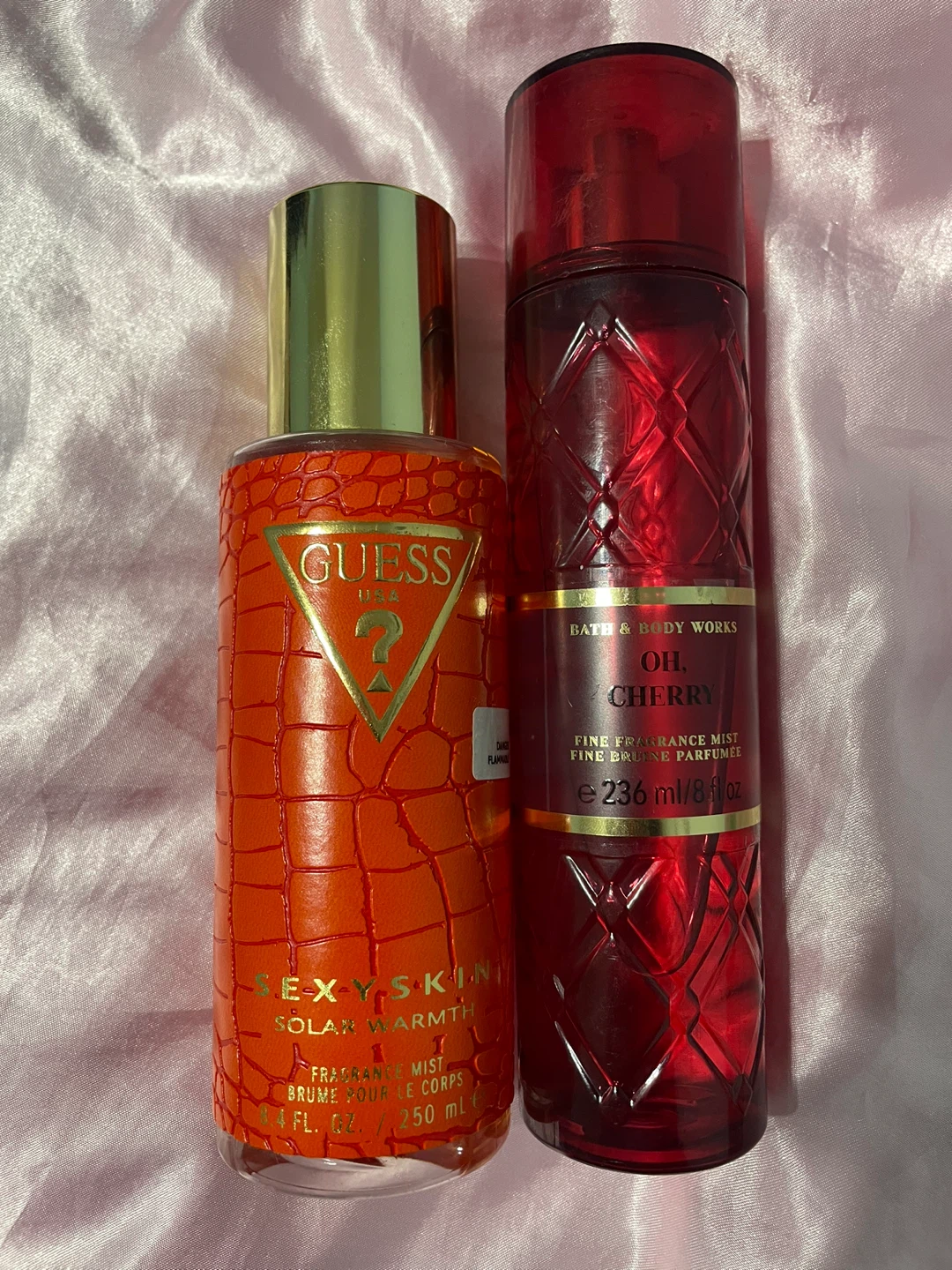Selling a Guess Sexy Skin Solar Warmth fragrance mist and a Oh, Cherry fine fragrance mist from Bath & Body Works. Both are a bit used and will be selling for 12 to 8 dollars each (Oh Cherry is fully macerated)