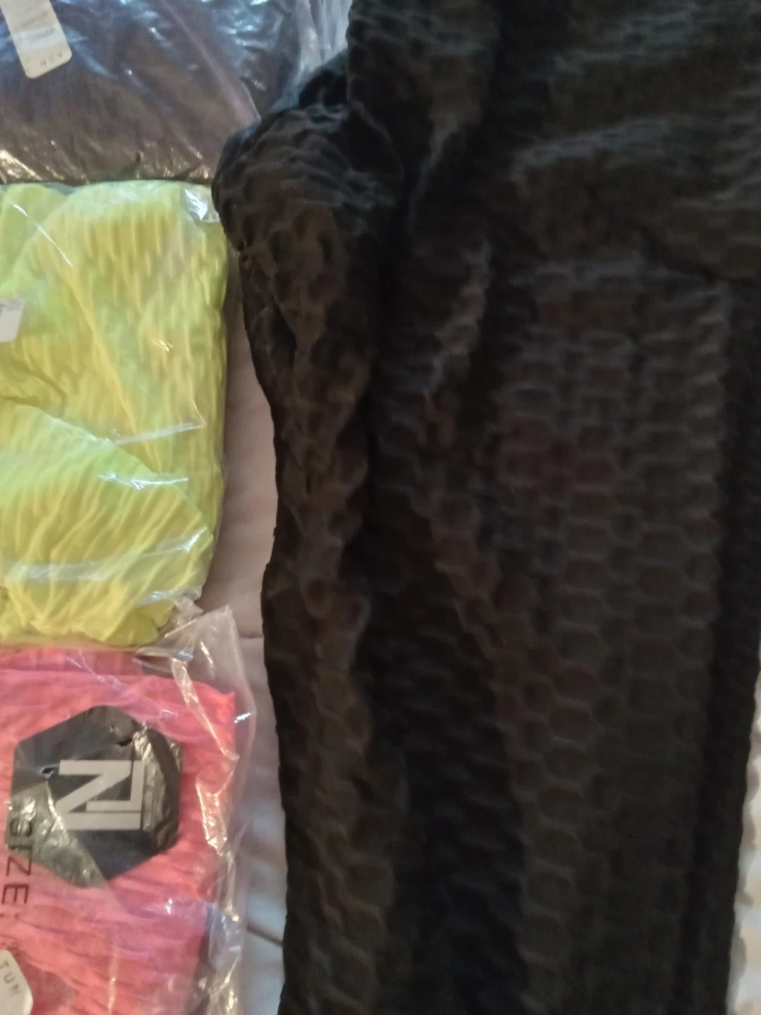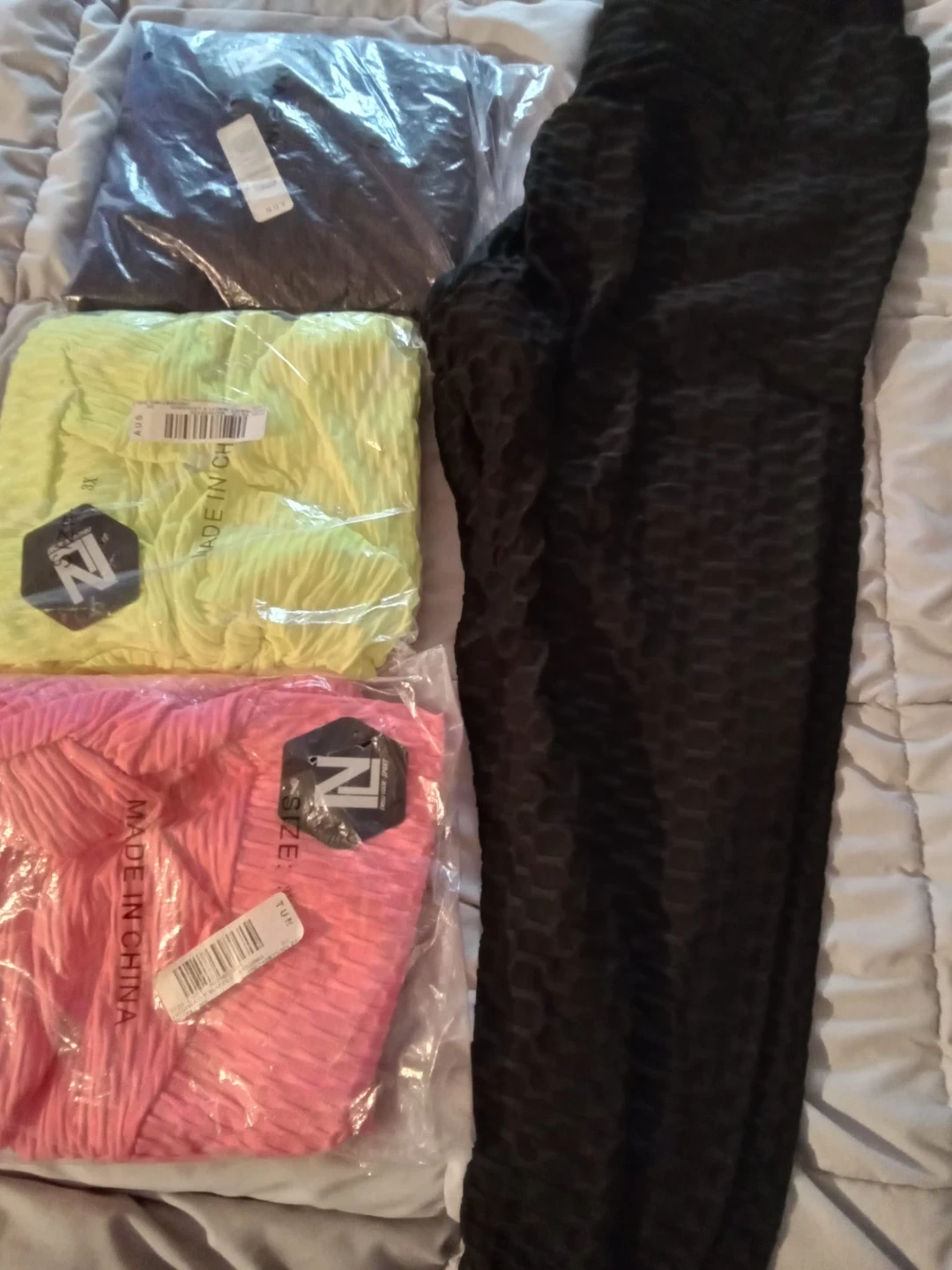 These high-waisted leggings offer a comfortable, textured fit. They're made from a stretchy, breathable fabric. Available in black, yellow, and pink. Great for workouts or casual wear! Size is 3X and price is $25 each. Brand new in original packaging. Bought at Rainbow in Buffalo.