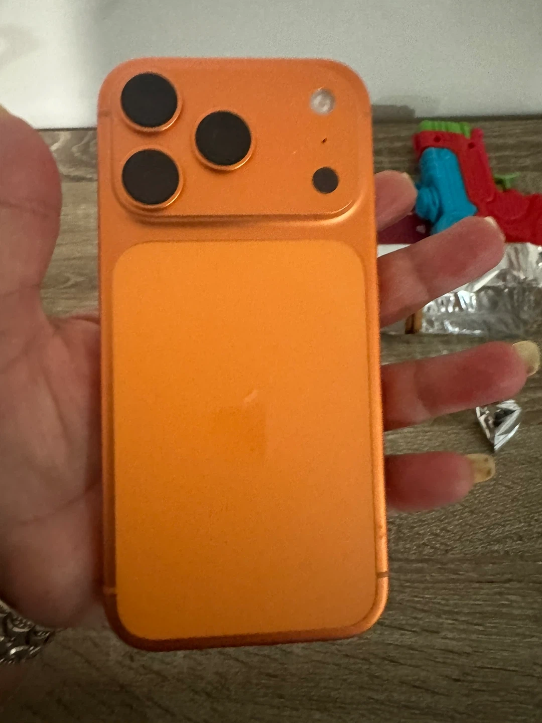 This is an orange iPhone 17. It has a triple-camera system and a vibrant display. Perfect for capturing photos and staying connected! With a battery life of 100%