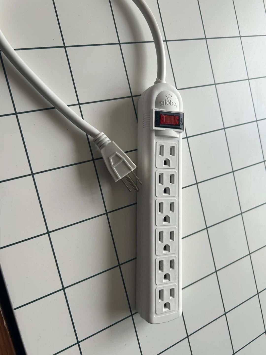 Globe Electric 6-outlet power strip. It's white and has a built-in on/off switch. This power bar is handy for expanding your outlets.