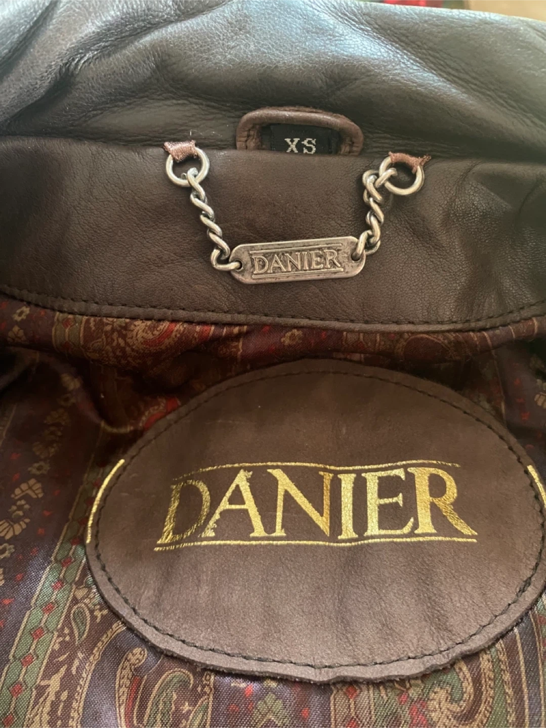 This is a Danier brown bomber jacket, made from suede and leather. It features a patterned silky lining and a metal zipper closure. The size is XS. Great for cooler weather!