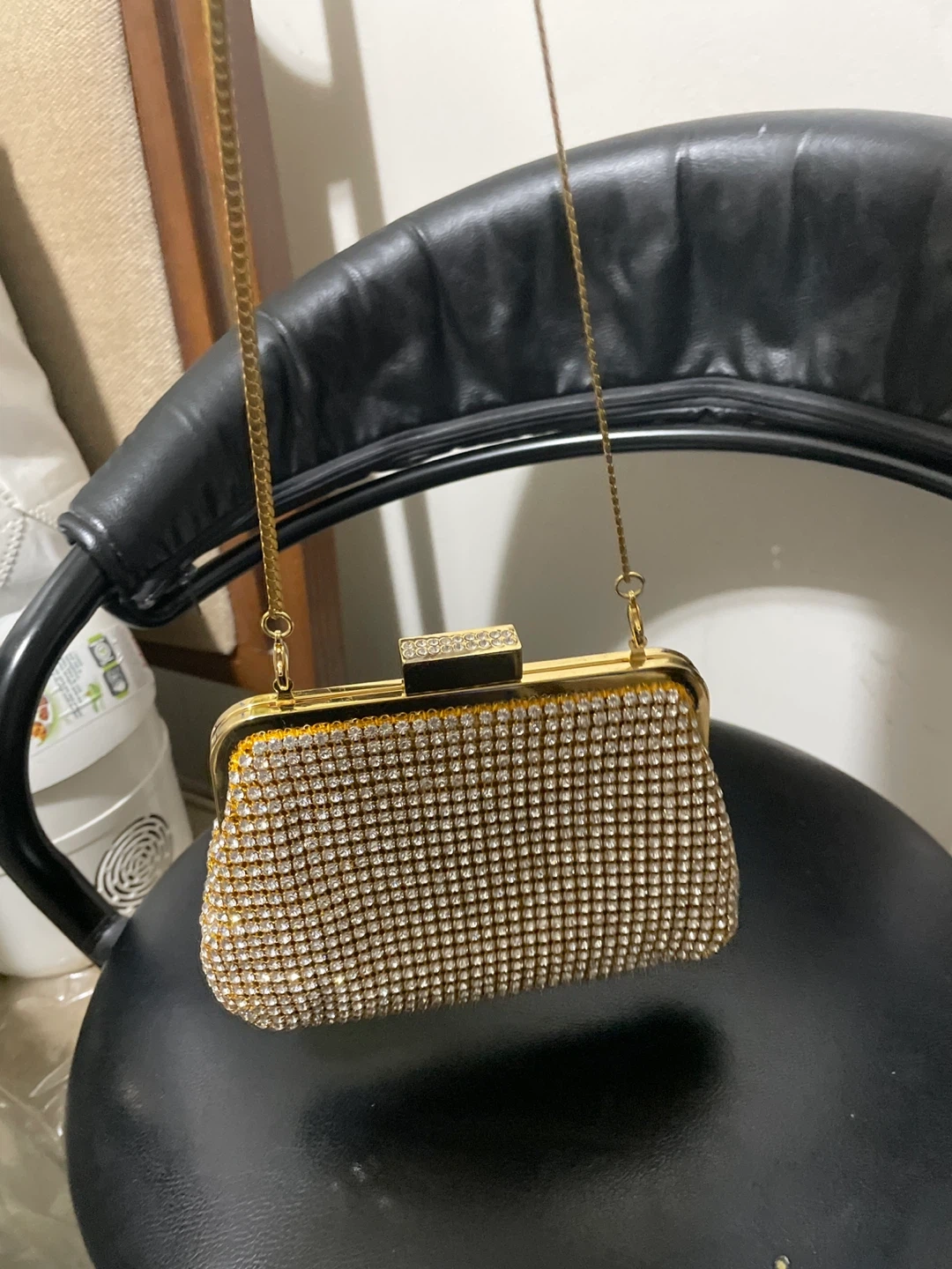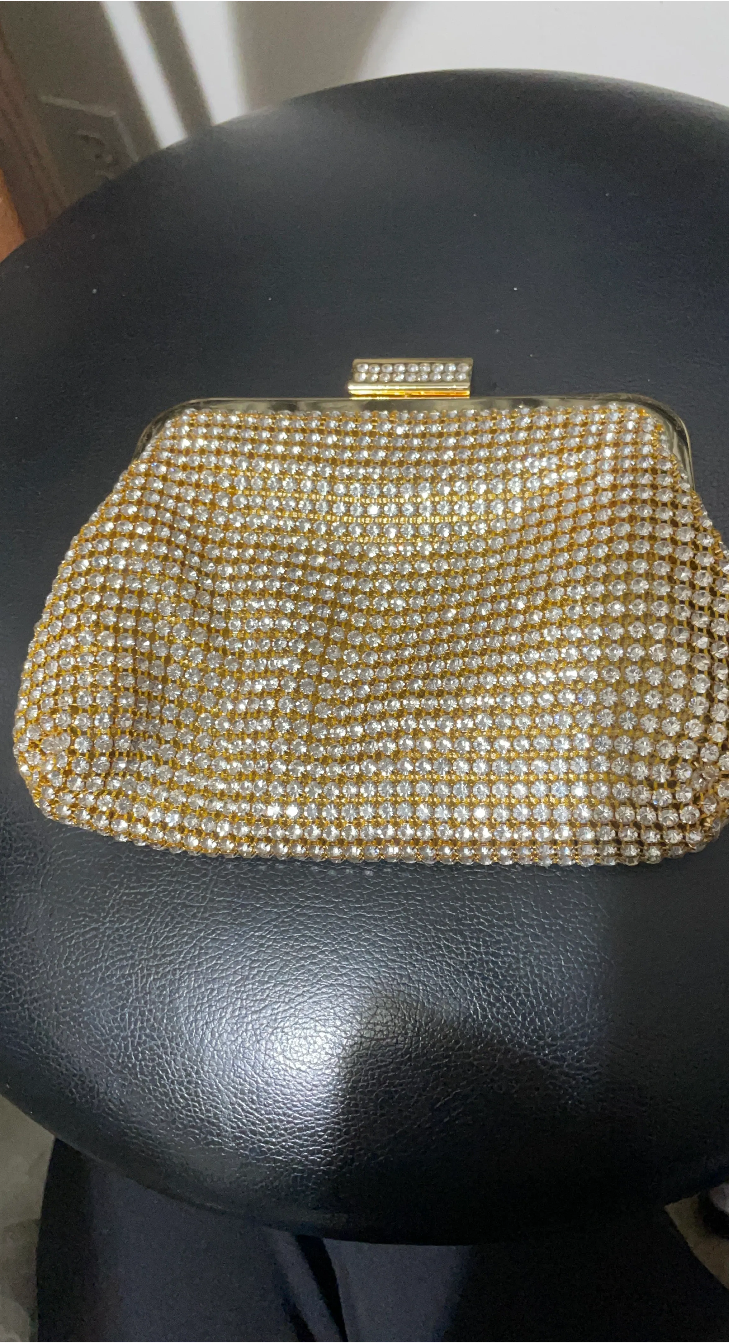 Selling a beautiful gold rhinestone clutch purse. It's perfect for a night out or a special occasion. The clutch has a gold chain strap for easy carrying