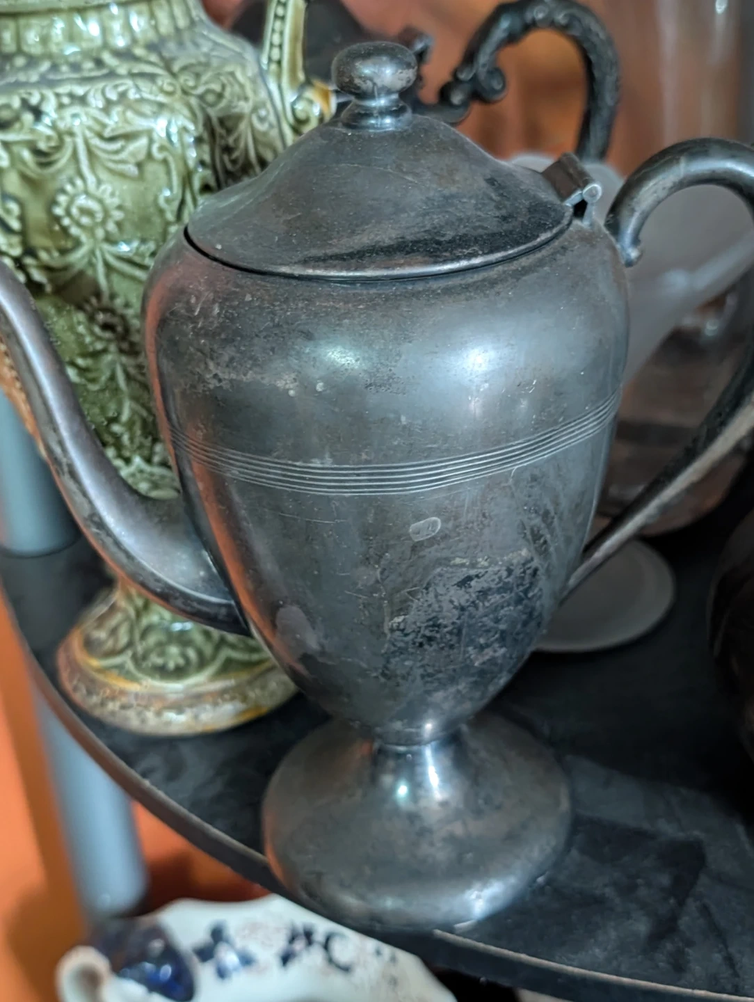 Selling a vintage silver teapot. It has a unique design and could be a great addition to your collection or for everyday use. It shows some signs of wear, which adds to its vintage charm!