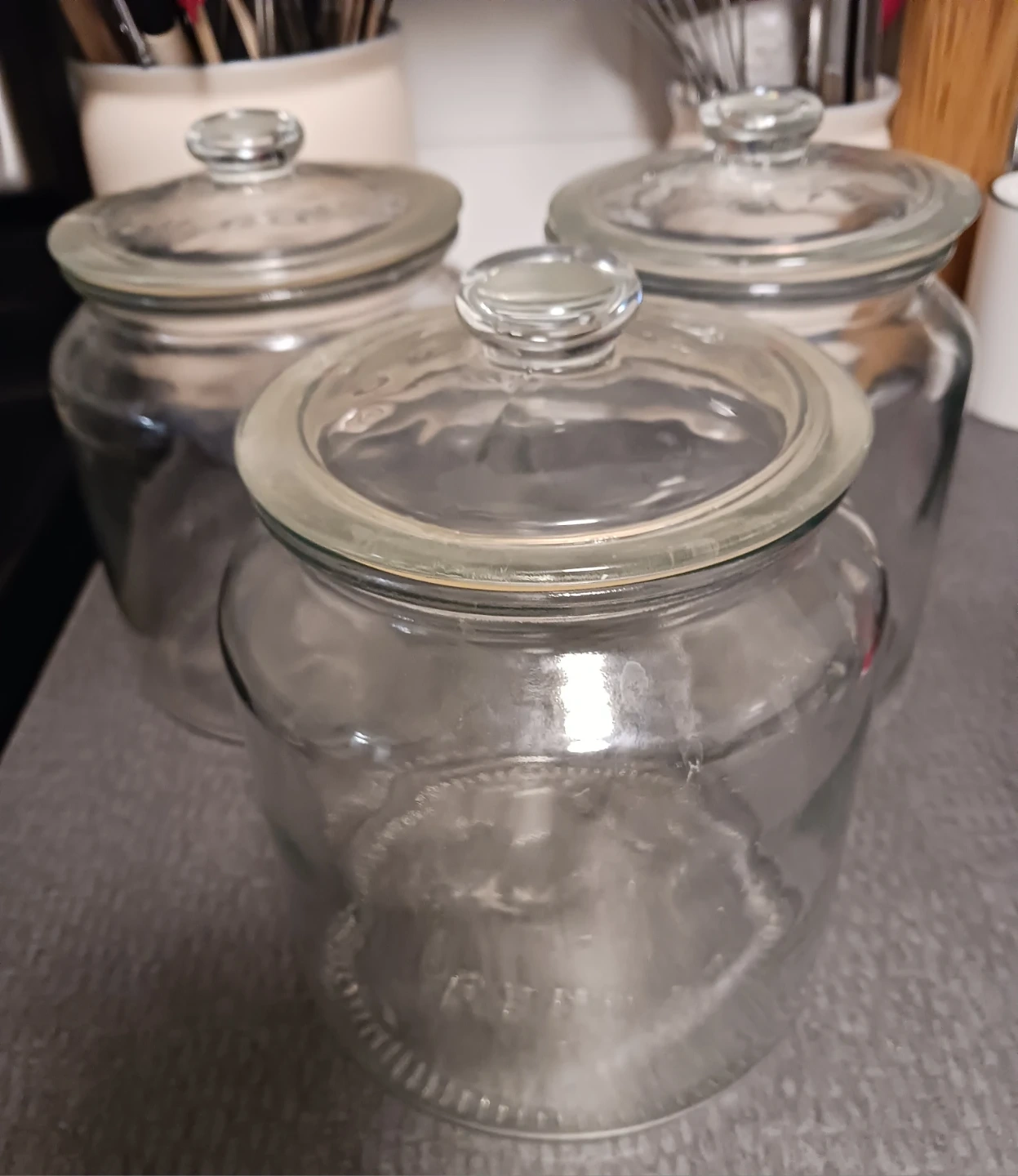 Selling a set of glass kitchen canisters. They come with lids and are great for storing dry goods or other kitchen items. They're in good condition and ready for a new home!
