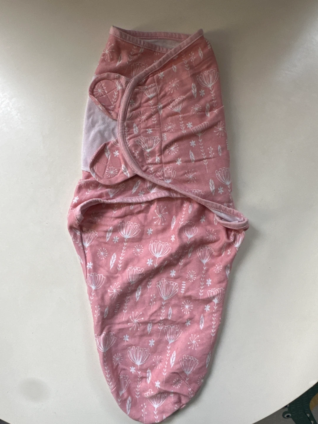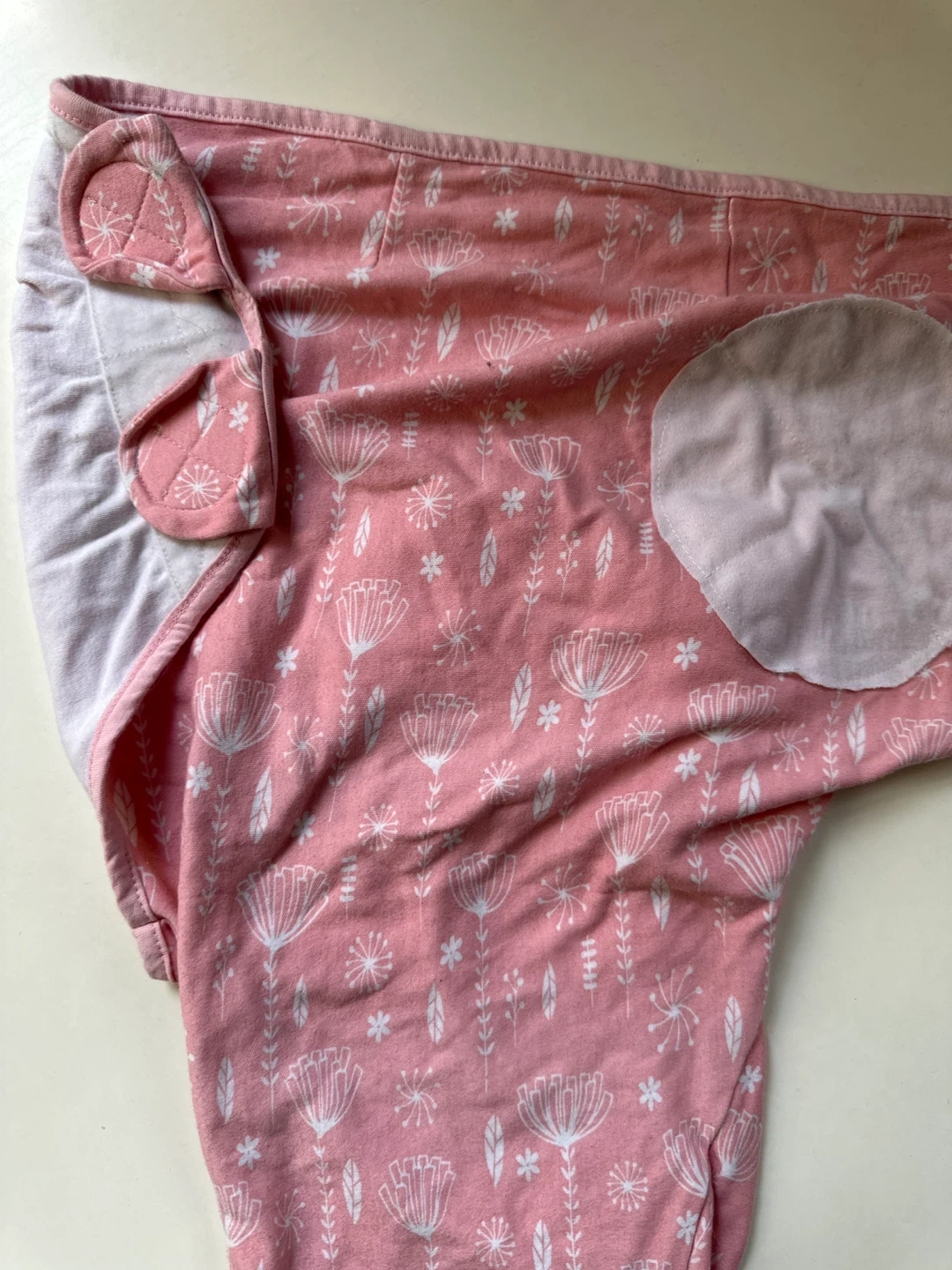 Pink floral print swaddle sleep sack for newborn babies. It has a hook and loop closure for easy adjustment. Soft cotton material.