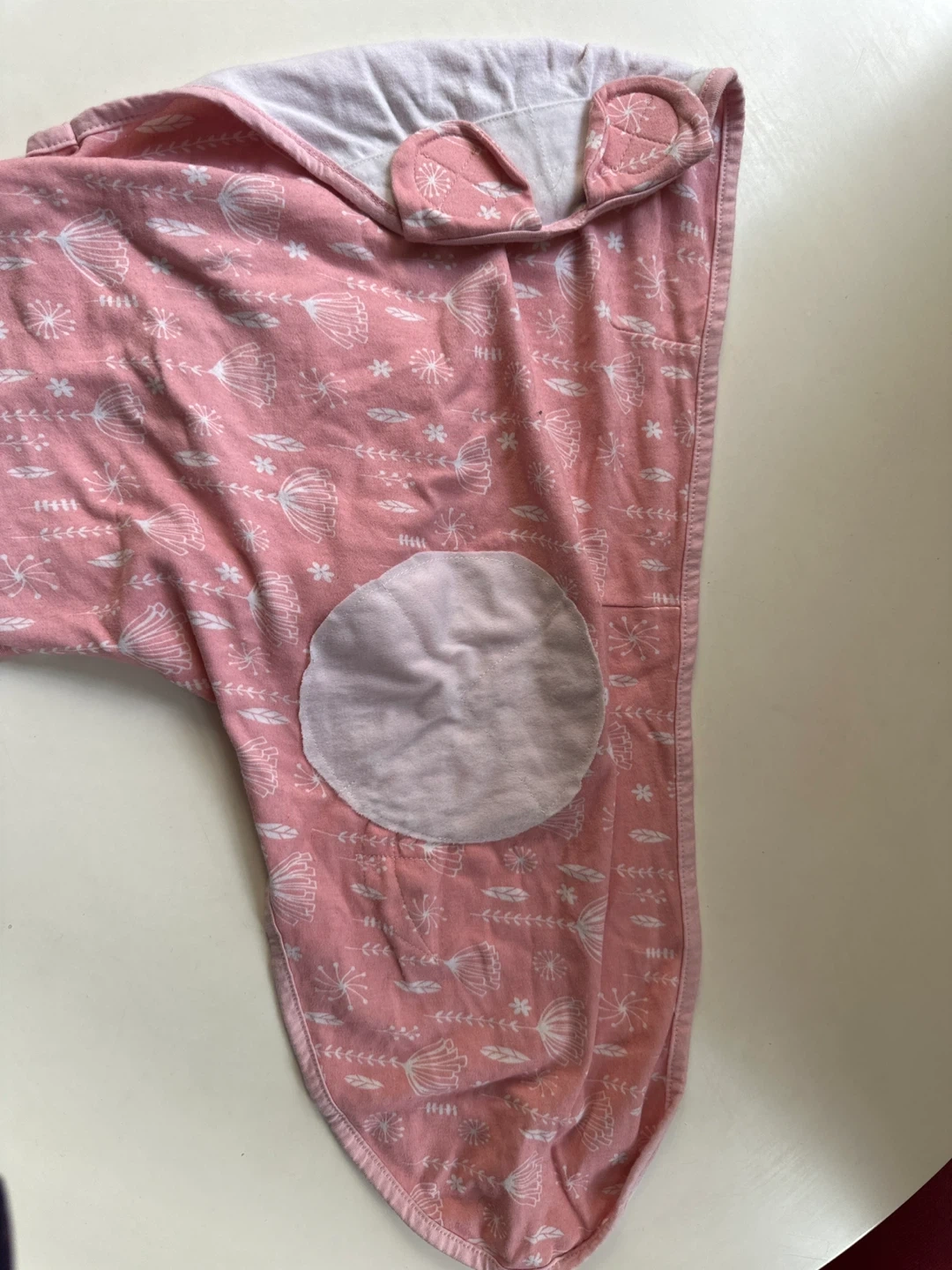 Pink floral print swaddle sleep sack for newborn babies. It has a hook and loop closure for easy adjustment. Soft cotton material.