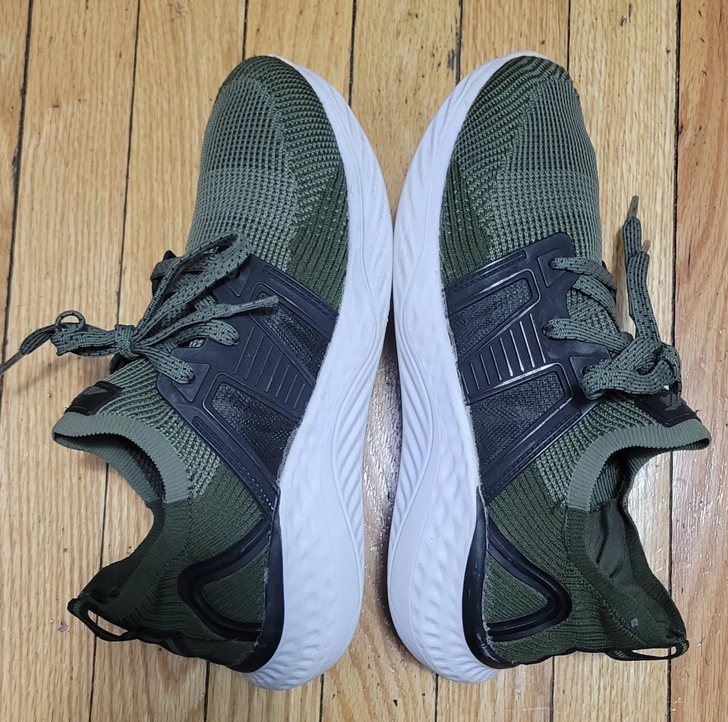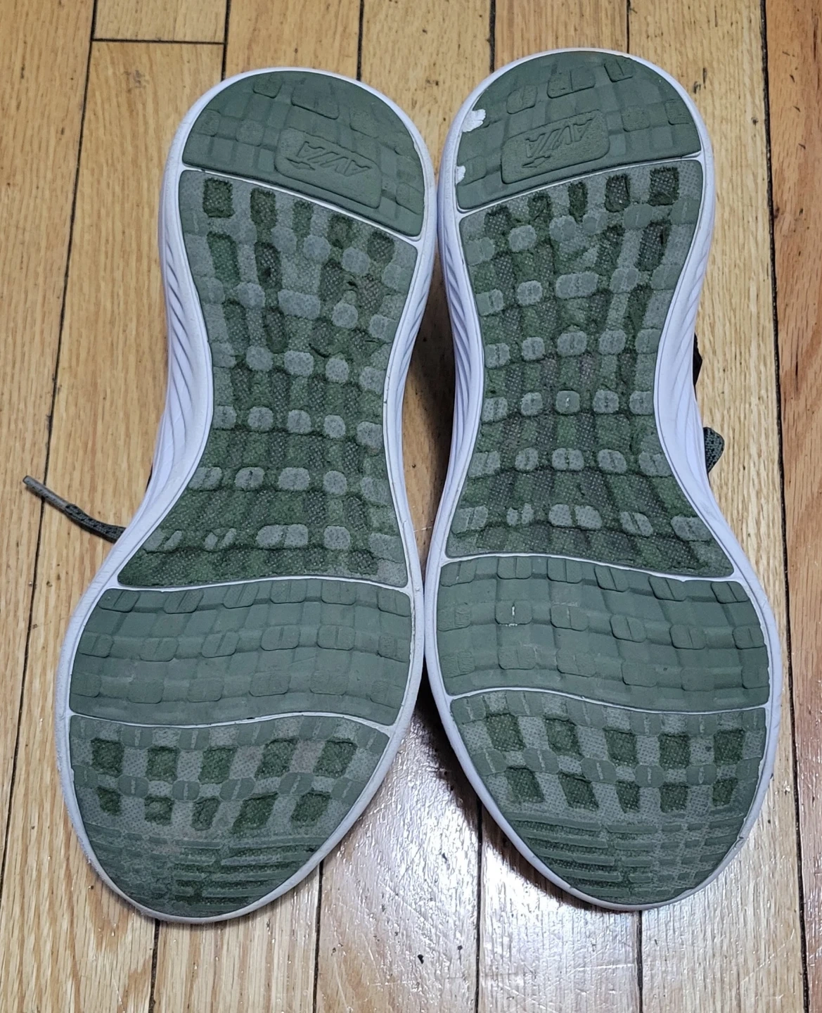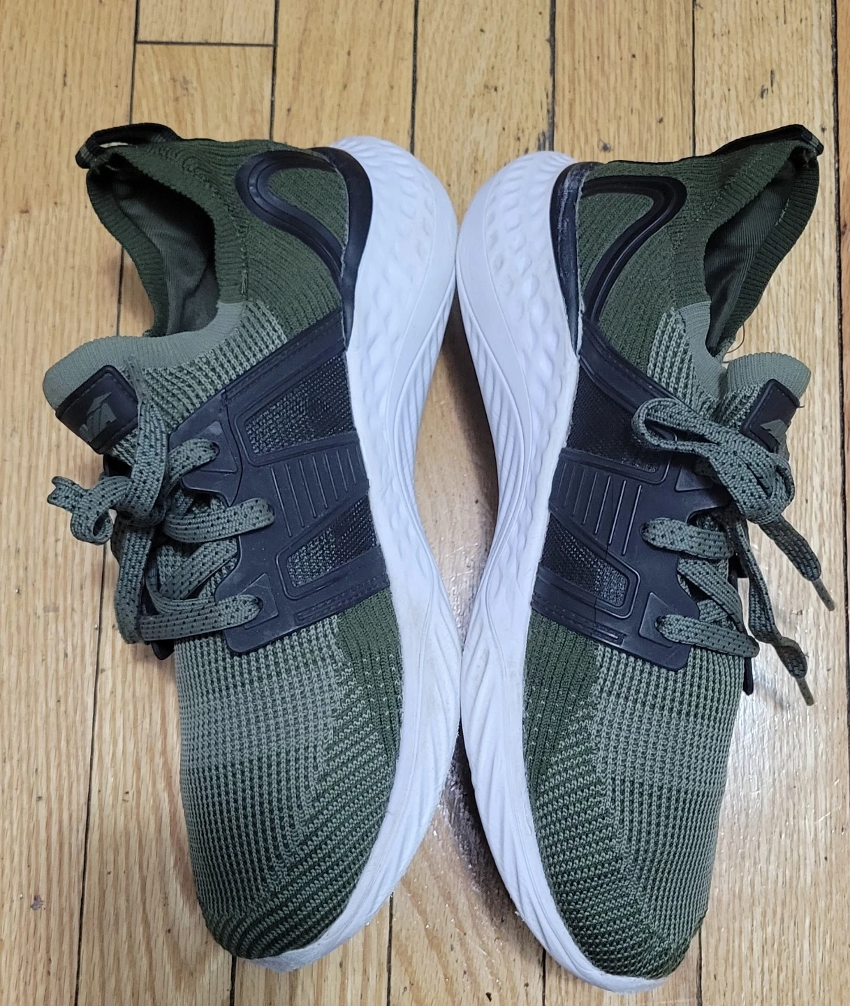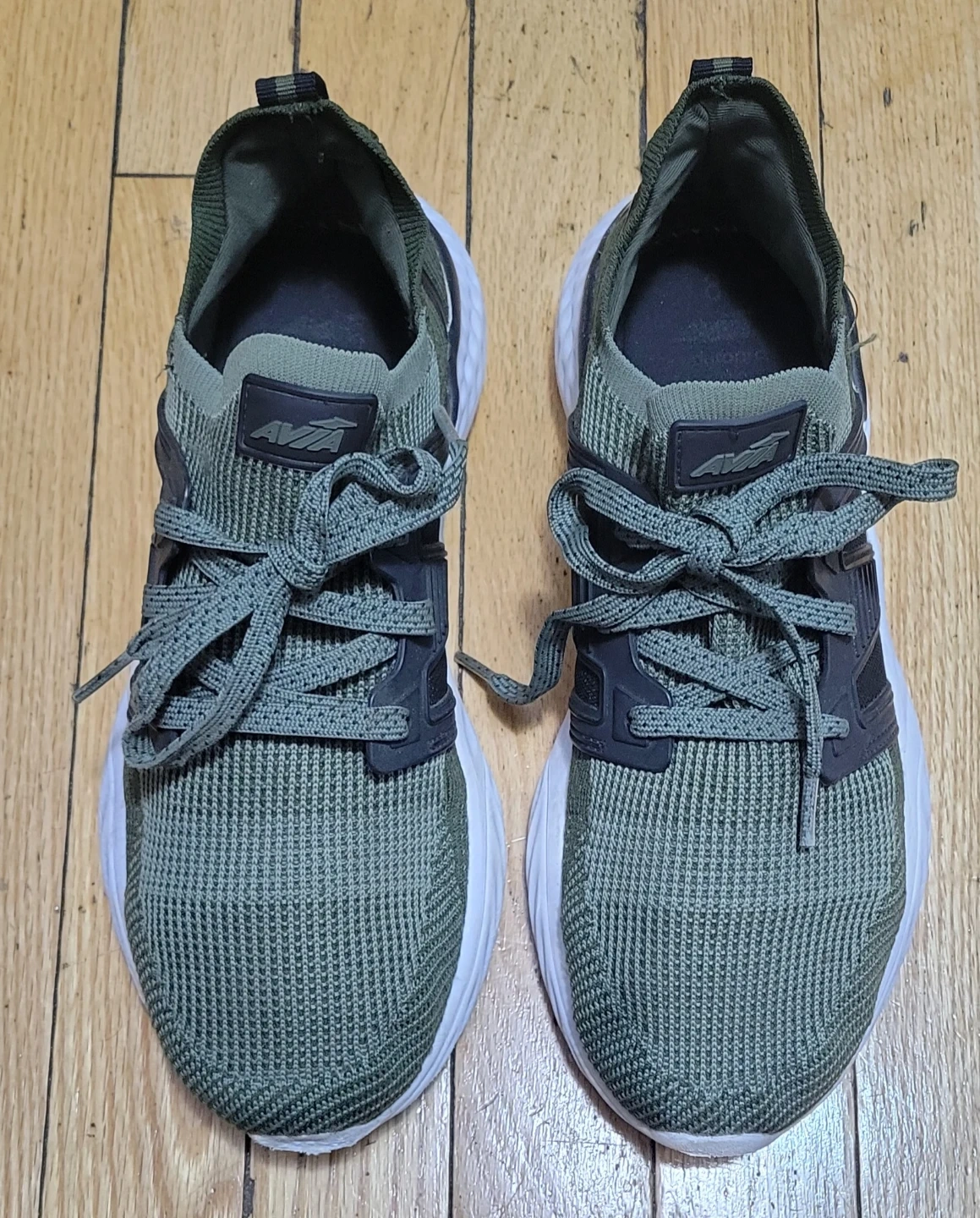 These are AVIA men's running shoes in a green and black colorway. They are a size 8 US Men's, EUR 40.5, and MEX 26. Made with all man-made materials. They feature a breathable knit upper and a cushioned sole.