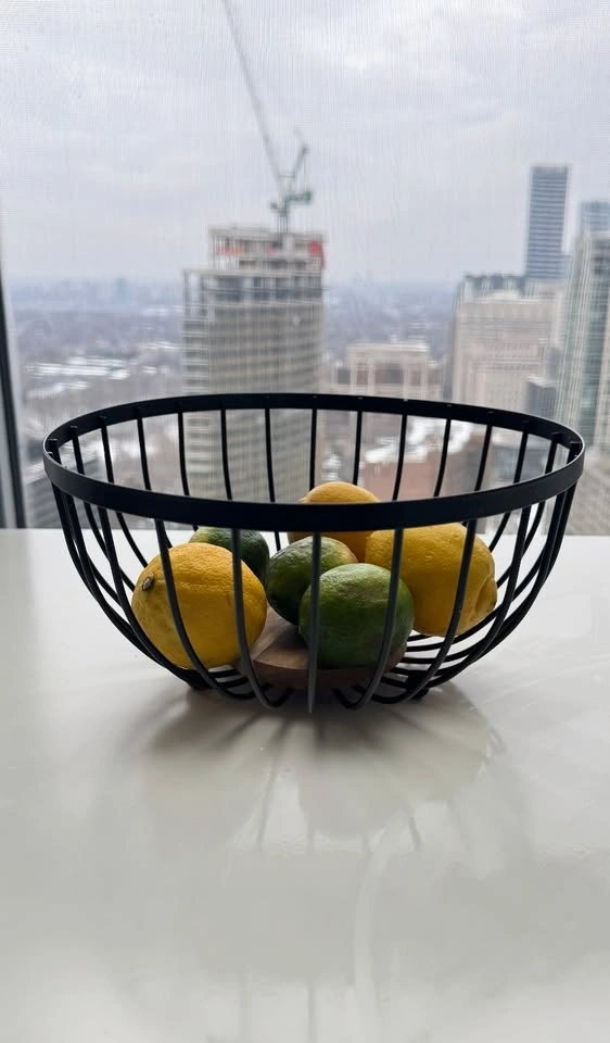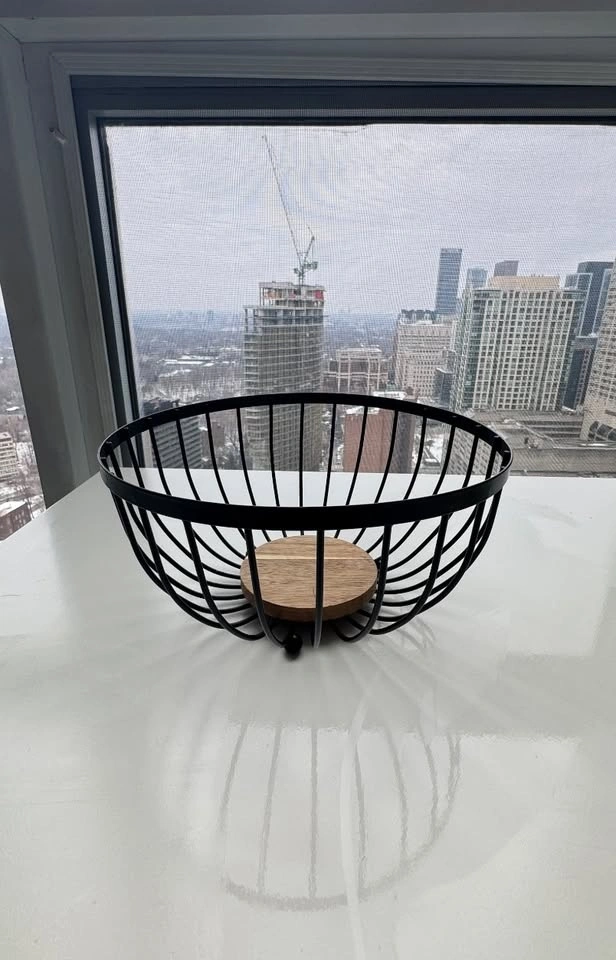 Modern black wire fruit bowl with wood base — perfect for kitchen counters, coffee tables, or pantry organization.