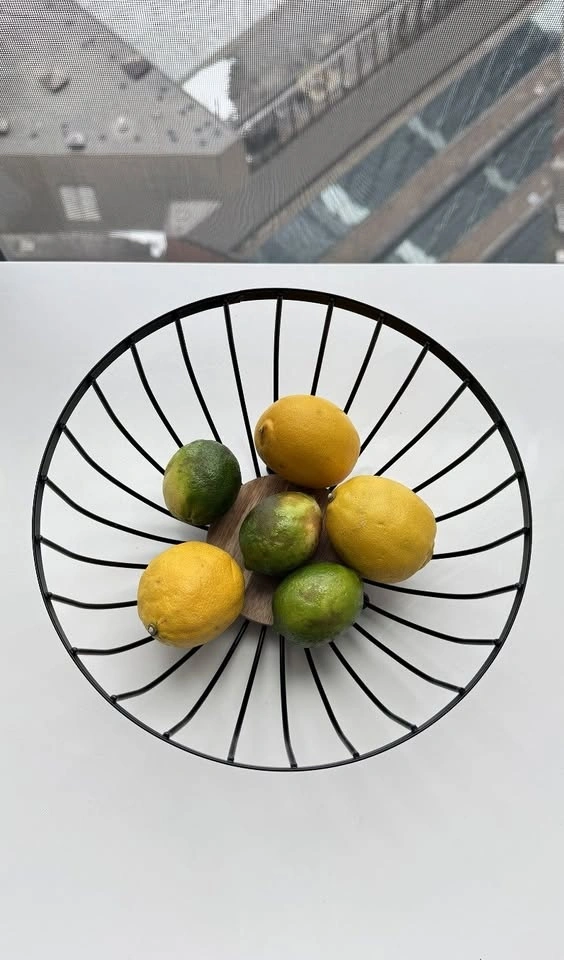 Modern black wire fruit bowl with wood base — perfect for kitchen counters, coffee tables, or pantry organization.