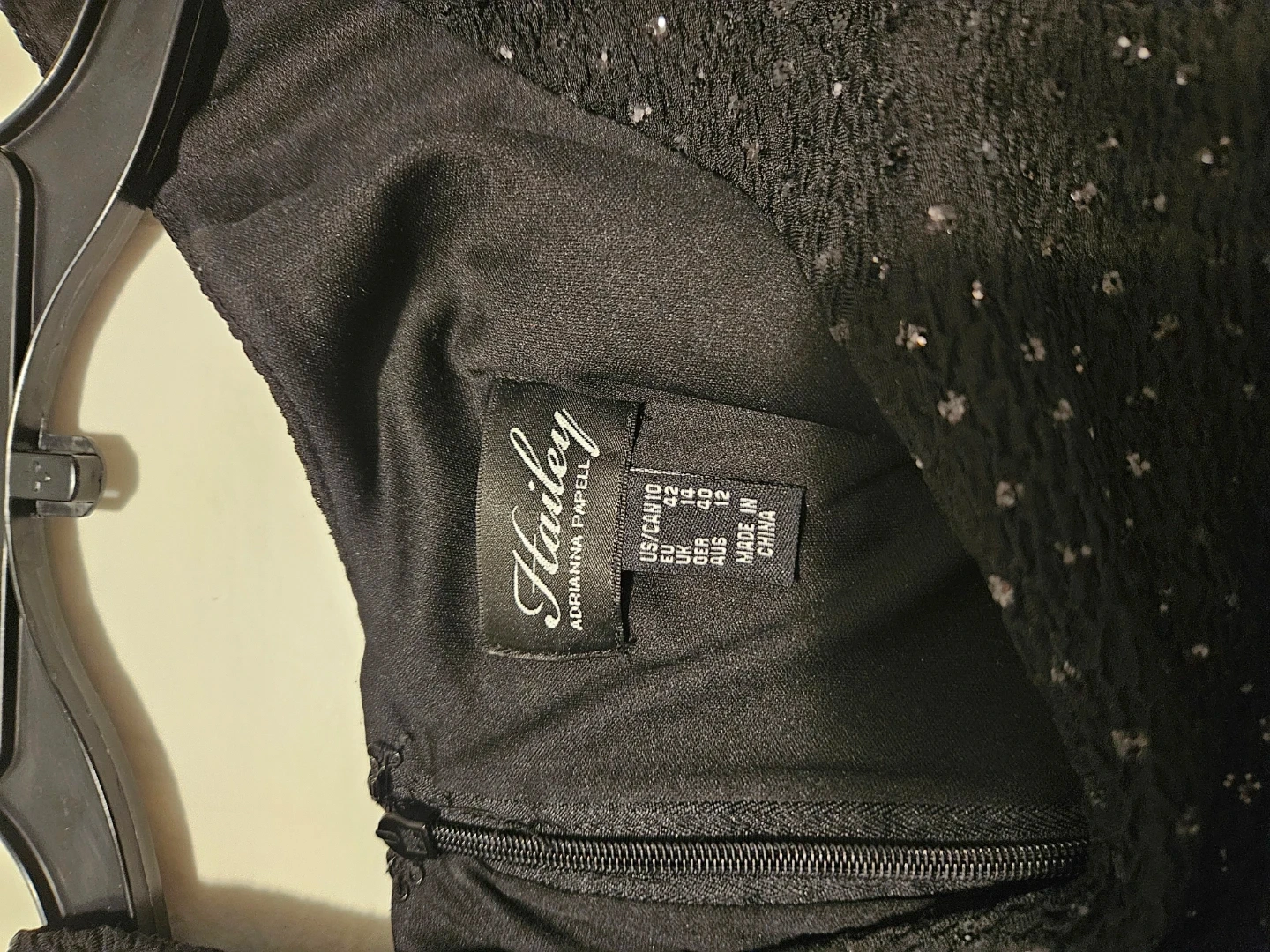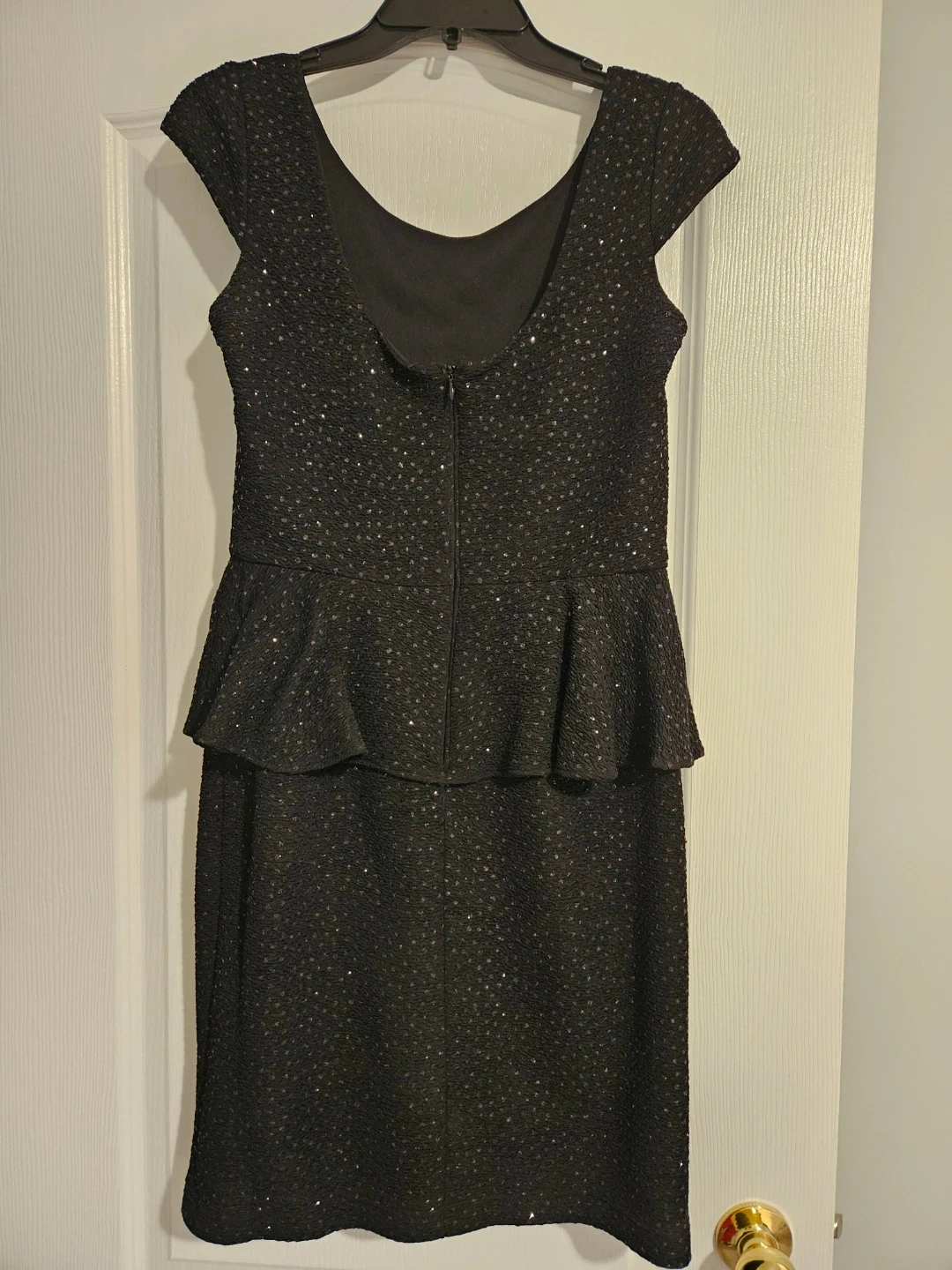This Hailey by Adrianna Papell dress is black and features a sequin design. It has a peplum waist and short cap sleeves. Dress size is US/CAN 10.