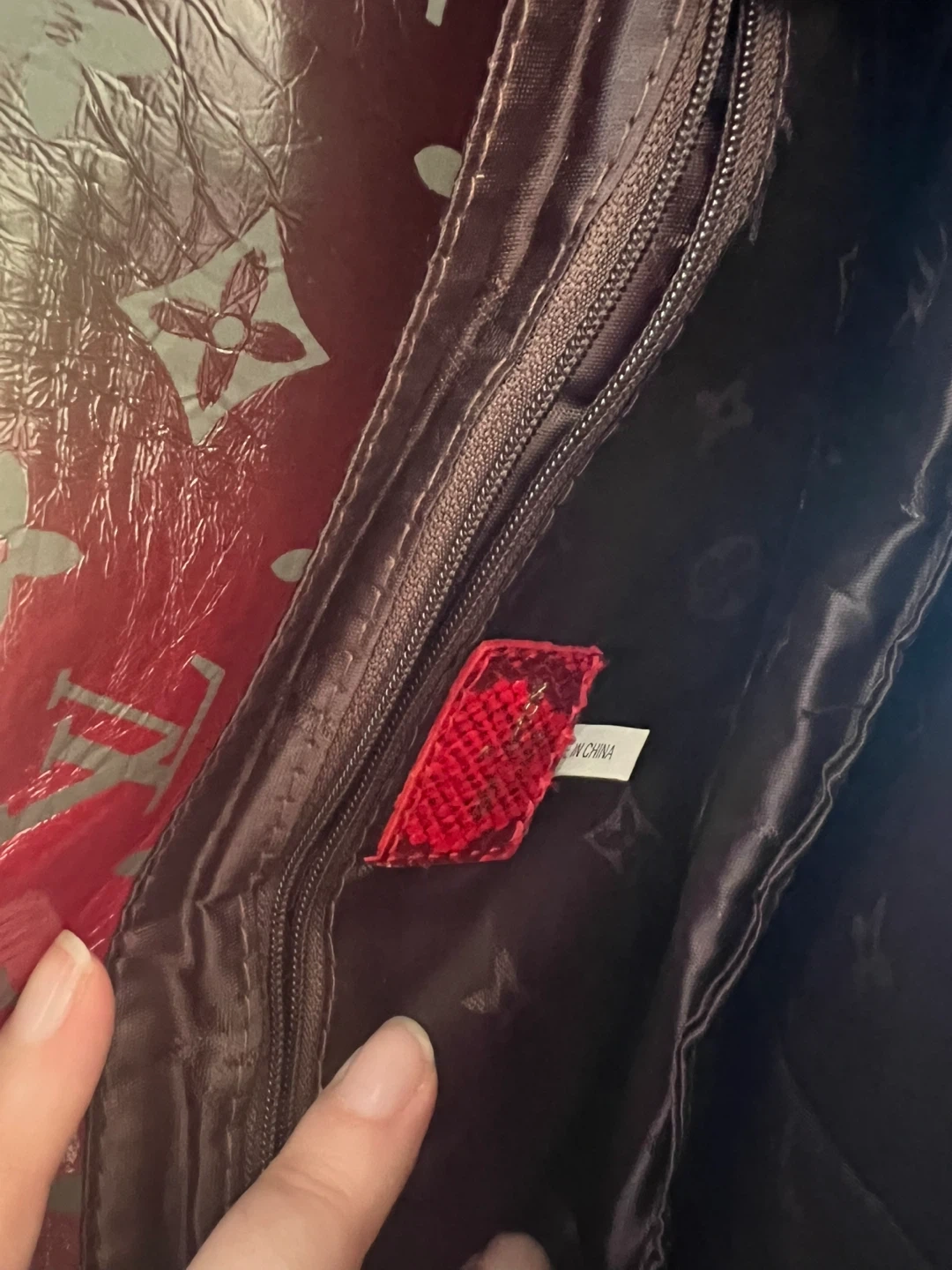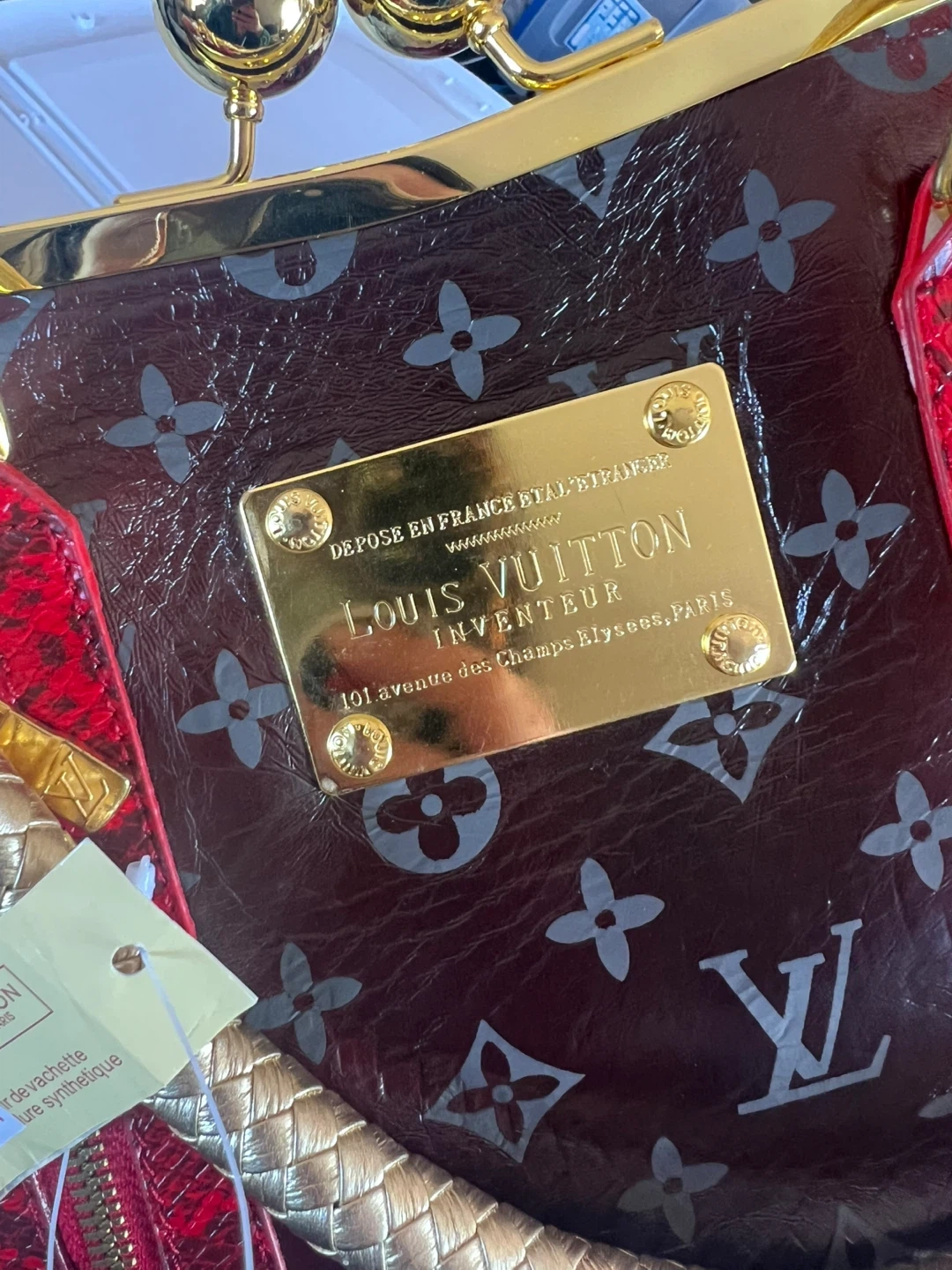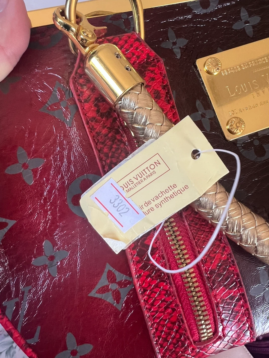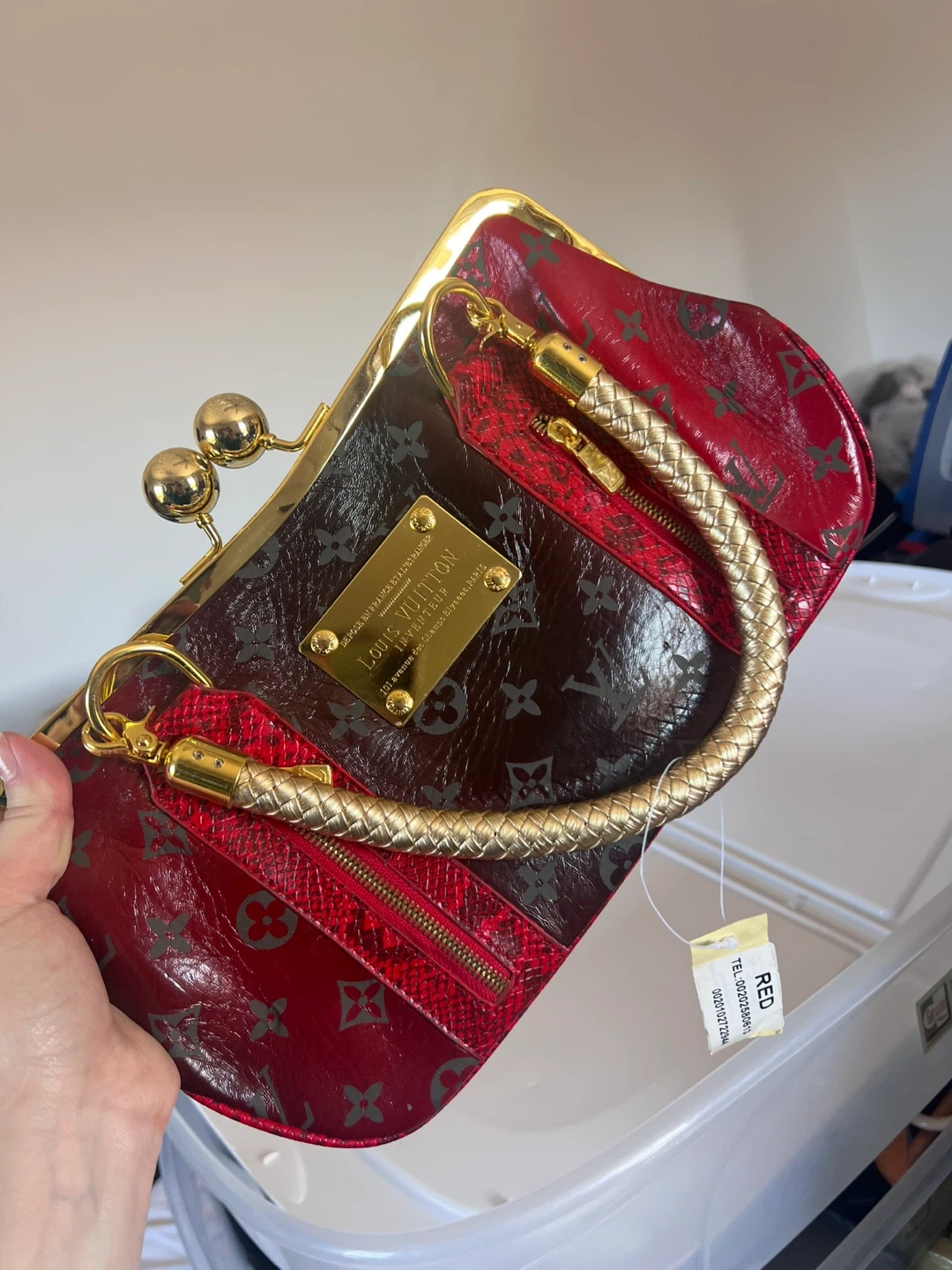This not authentic Louis Vuitton clutch features the iconic monogram pattern in red and brown. It has a kiss-lock closure and a decorative gold-tone hardware. The interior is lined with red fabric and includes a zippered pocket. Made in China.