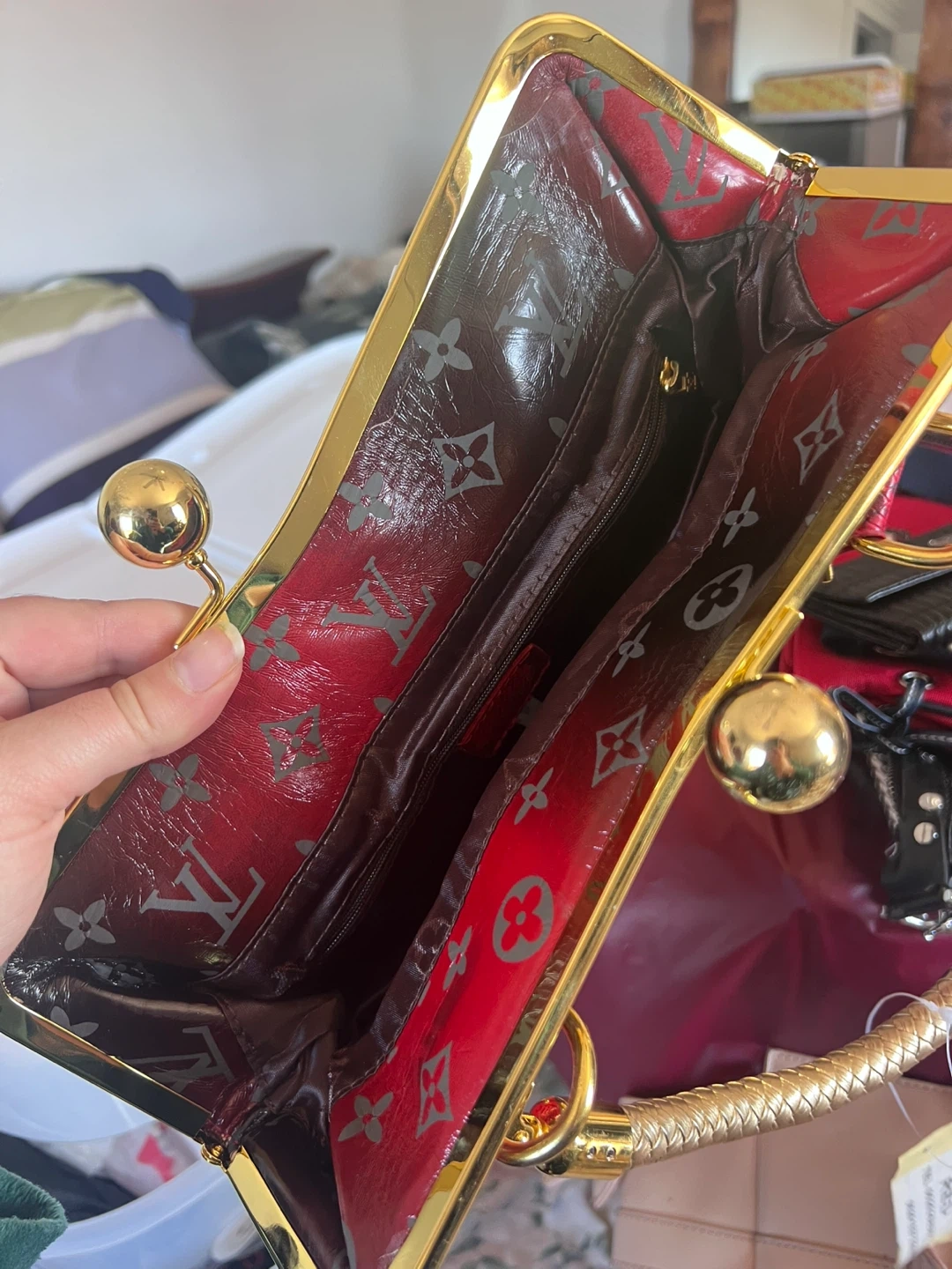 This not authentic Louis Vuitton clutch features the iconic monogram pattern in red and brown. It has a kiss-lock closure and a decorative gold-tone hardware. The interior is lined with red fabric and includes a zippered pocket. Made in China.