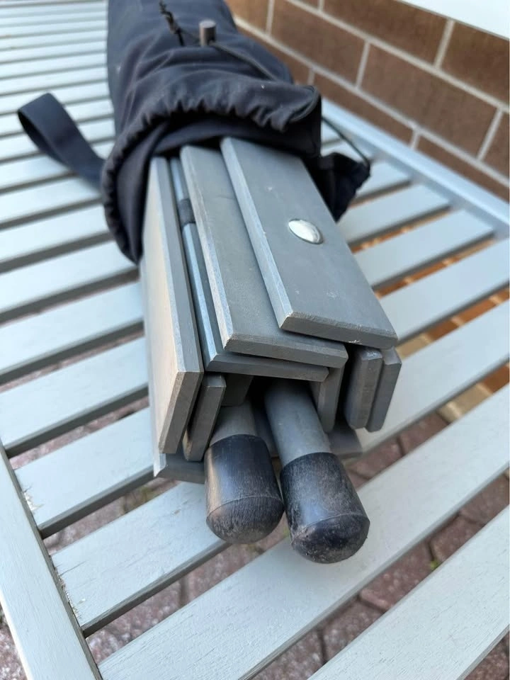 Great condition wooden outdoor table from Crate and Barrel. Used a few times during the pandemic but stored indoors since. Great for the park or beach on top of a picnic blanket. Very sturdy and easy to assemble. 27.5"Wx27.5"Dx15.5"H. Made of 100% FSC®-certified mahogany with grey finish. Features zinc-plated nuts and protective caps on feet. Comes with a 100% cotton canvas bag (dry clean to prevent shrinkage).