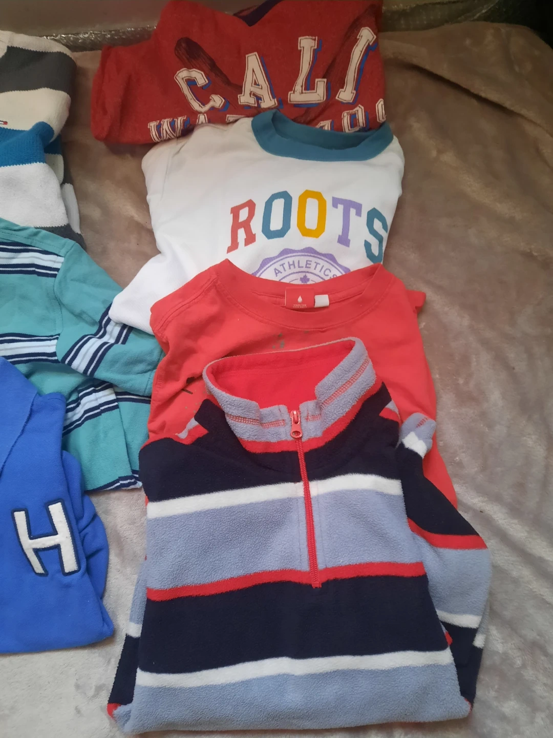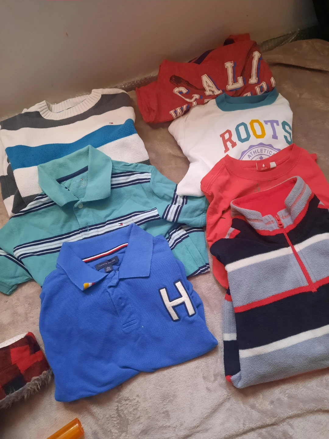 This bundle includes a selection of boys' tops. Features two Tommy Hilfiger polos, a striped sweater, a "California" graphic tee, a "Roots Athletic" shirt, and a striped fleece zip-up. Great for everyday wear!