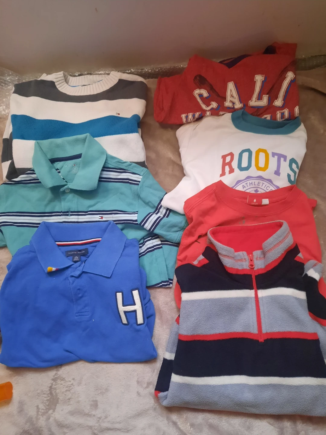 This bundle includes a selection of boys' tops. Features two Tommy Hilfiger polos, a striped sweater, a "California" graphic tee, a "Roots Athletic" shirt, and a striped fleece zip-up. Great for everyday wear!