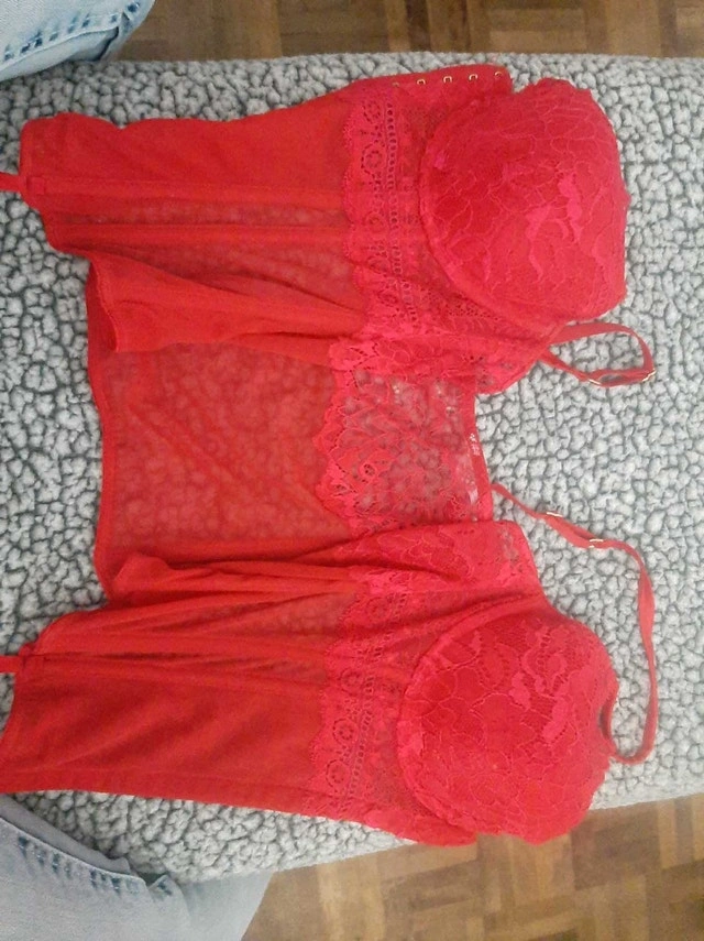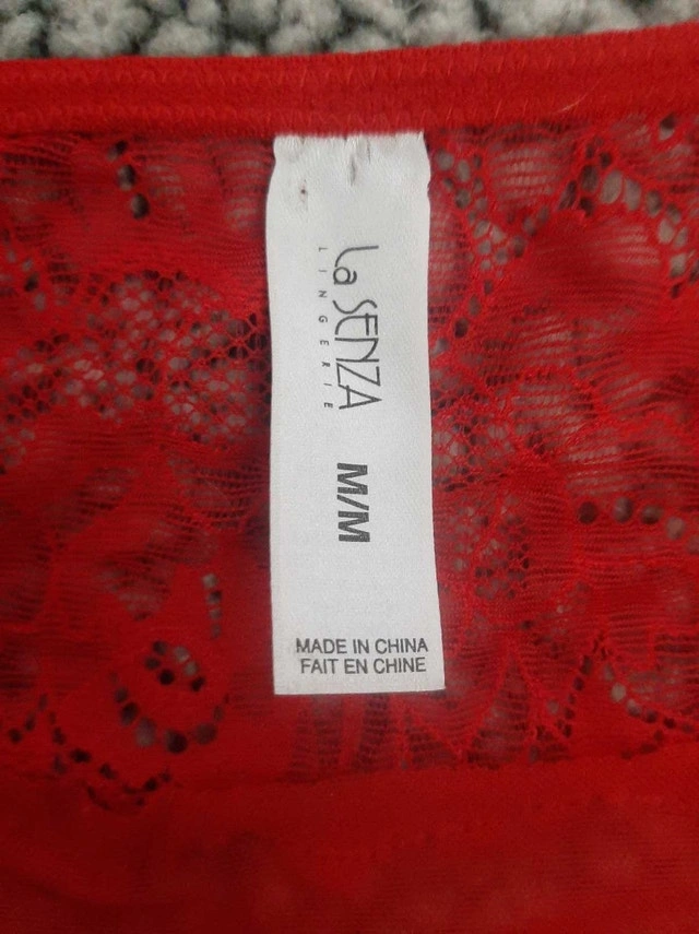 Spice things up with this red La Senza lingerie! It's a medium size and is in excellent condition, ready to add a touch of romance to your wardrobe. Key features include: - Vibrant red colour - Delicate lace detailing - Adjustable straps for a perfect fit - Comfortable and flattering design If this ad is still twirling on the screen, then yes, it's still available. Grab it before someone else does!