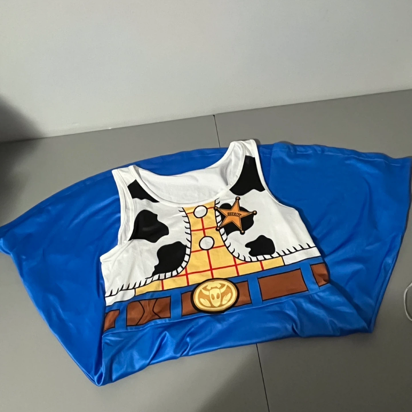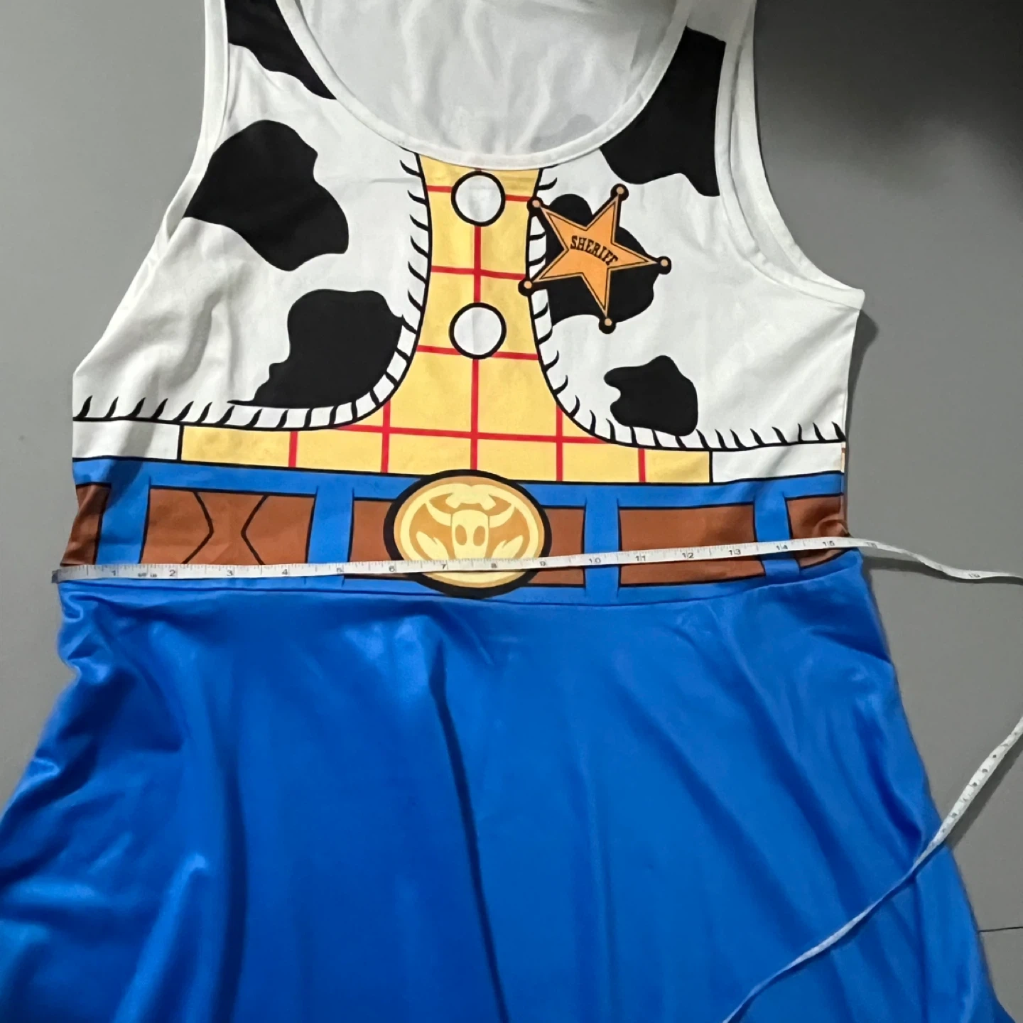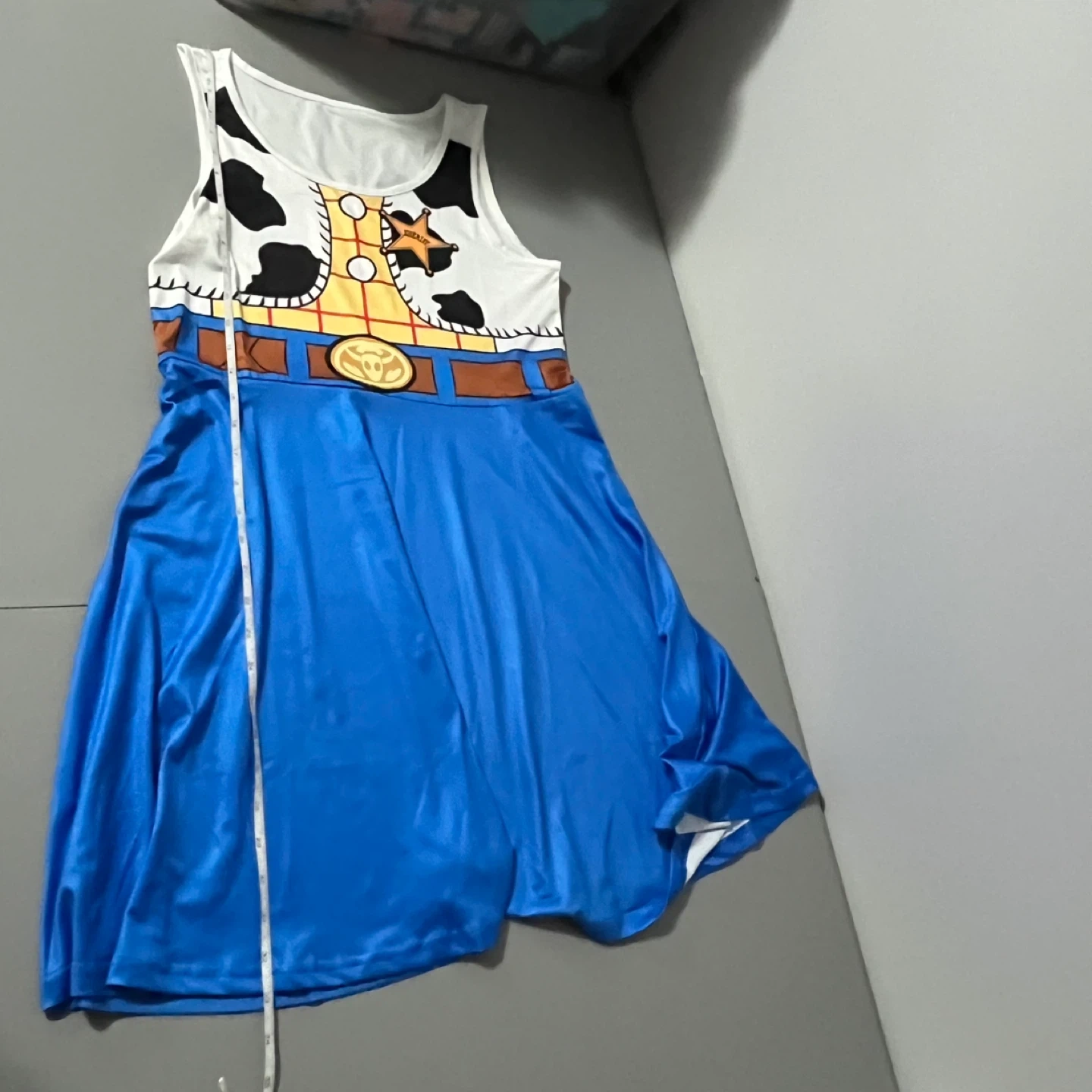 Howdy, partner! I'm selling a gently used Toy Story Woody-inspired dress. It's a size small and made of 95% polyester and 5% elastane. The dress features a fun design that captures Woody's iconic look. Machine wash cold on a gentle cycle with like colours