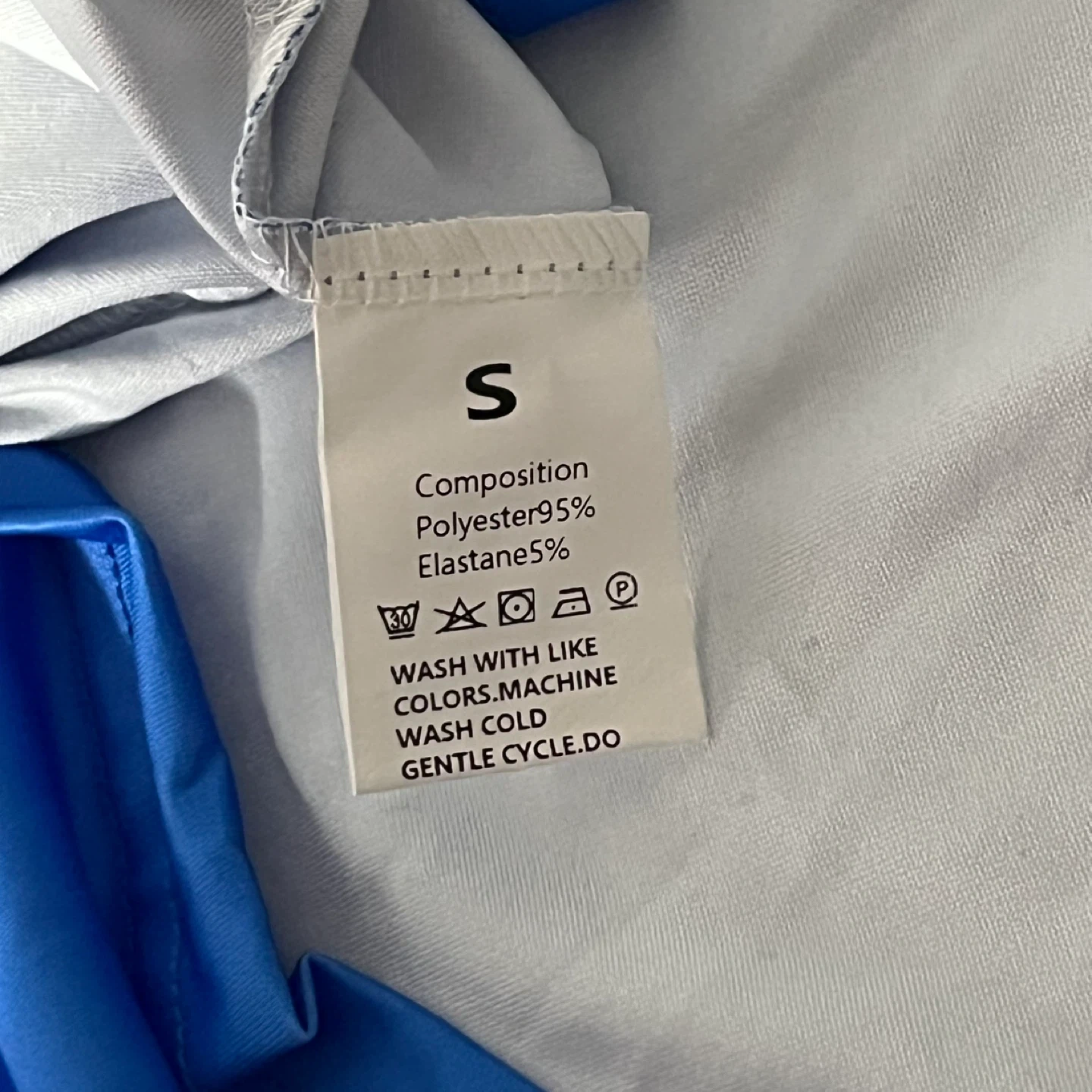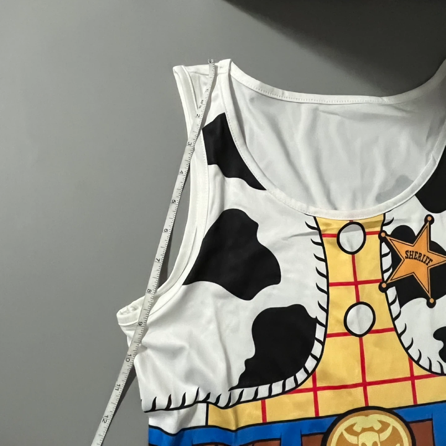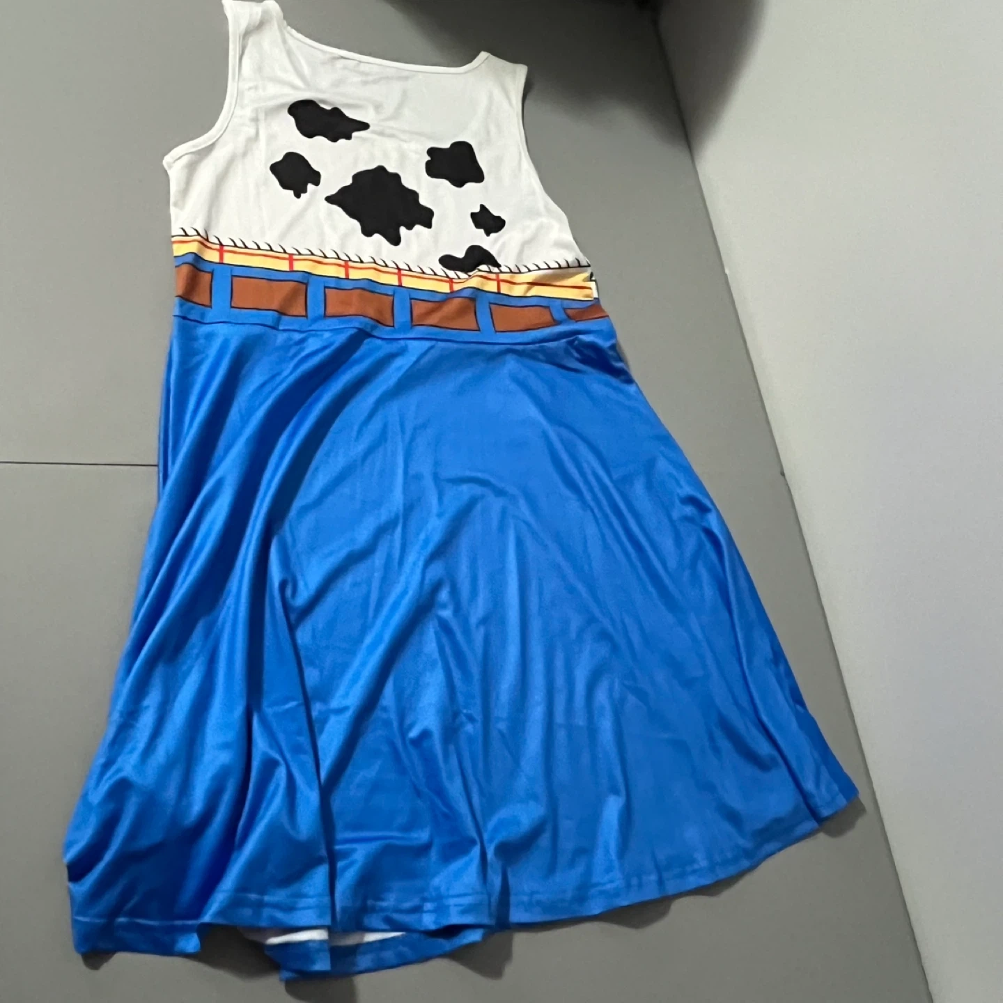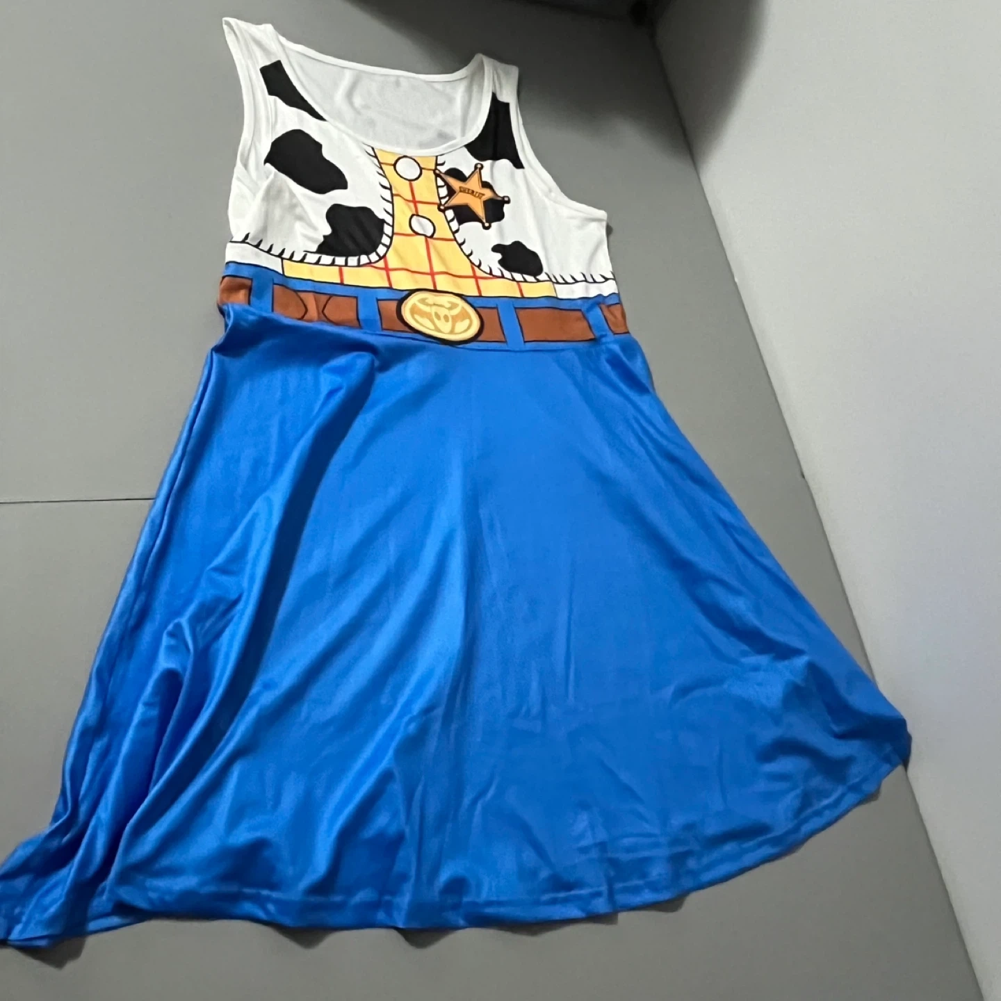 Howdy, partner! I'm selling a gently used Toy Story Woody-inspired dress. It's a size small and made of 95% polyester and 5% elastane. The dress features a fun design that captures Woody's iconic look. Machine wash cold on a gentle cycle with like colours