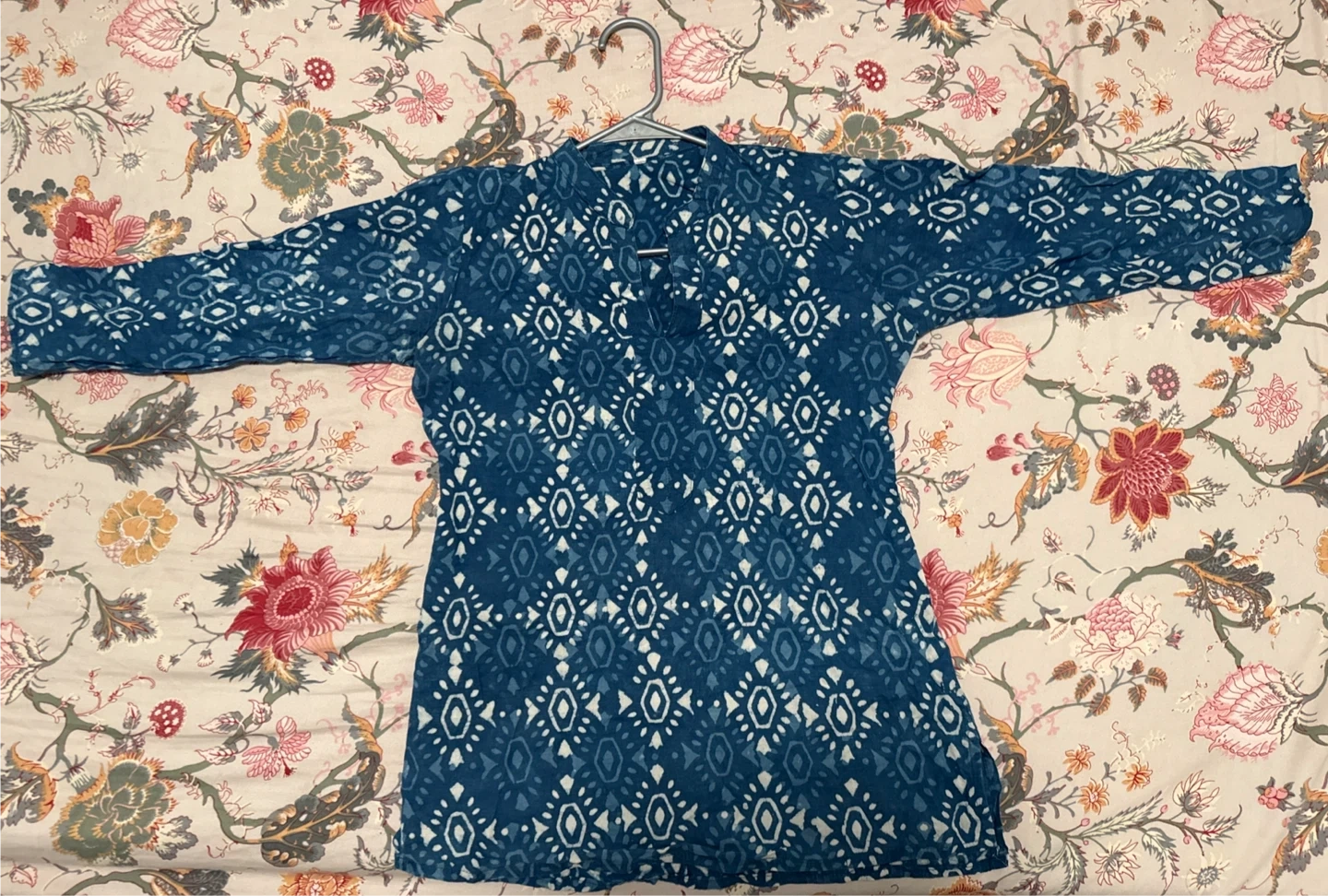 Beautiful indigo blue long sleeve top with a white geometric pattern. Lightweight, breathable fabric - perfect for everyday wear or summer outings. Features a simple V-notch neckline and a relaxed fit. Gently used and in great condition with no stains or tears.