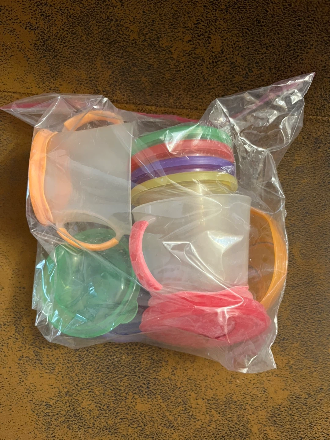 This is a set of 5 baby sippy cups and 2 snack containers They come in various colours: orange, pink, green, red, purple, and yellow. The cups are made of plastic. They're perfect for little ones learning to drink independently!