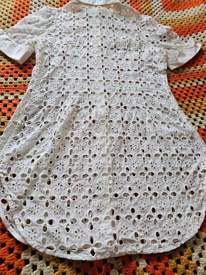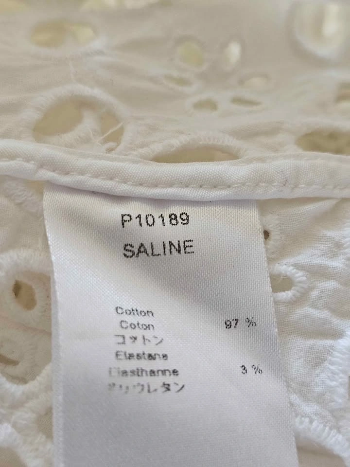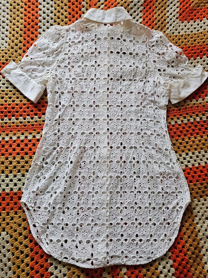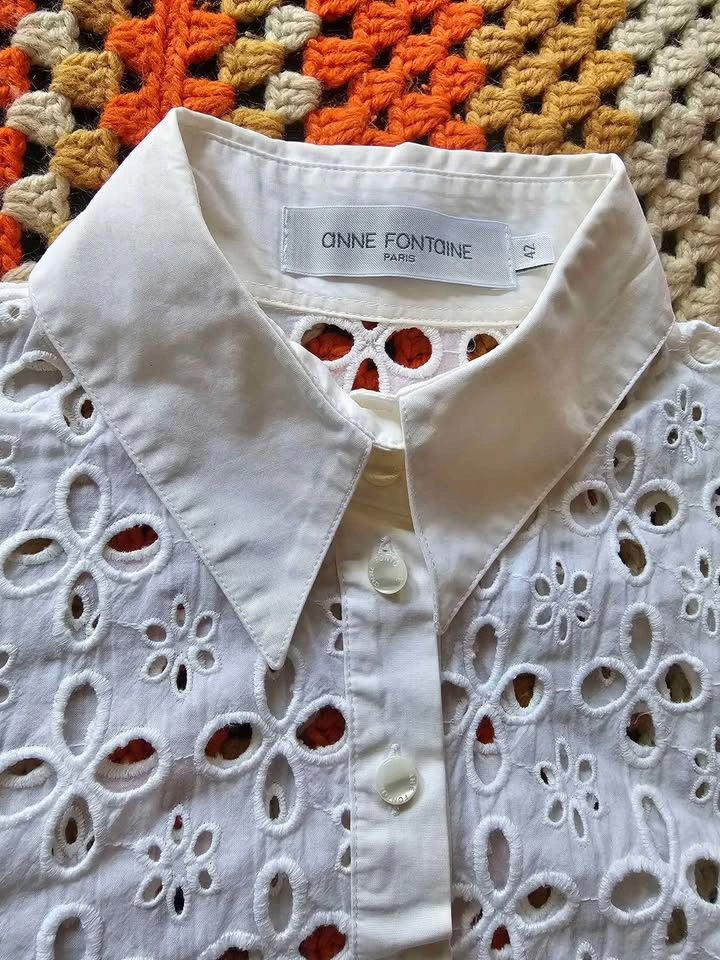 Beautiful button down short sleeve Saline shirt dress from luxury Parisian designer Anne Fontaine. Dress has a crisp collar and sleeve cuffs, and is made of elegant white eyelet lace in a subtle but feminine pattern. Perfect for old money aesthetic European looks. Dress buttons with mother of pearl style buttons that all have an embossed logo. This is a timeless and classic look that will never go out of style.