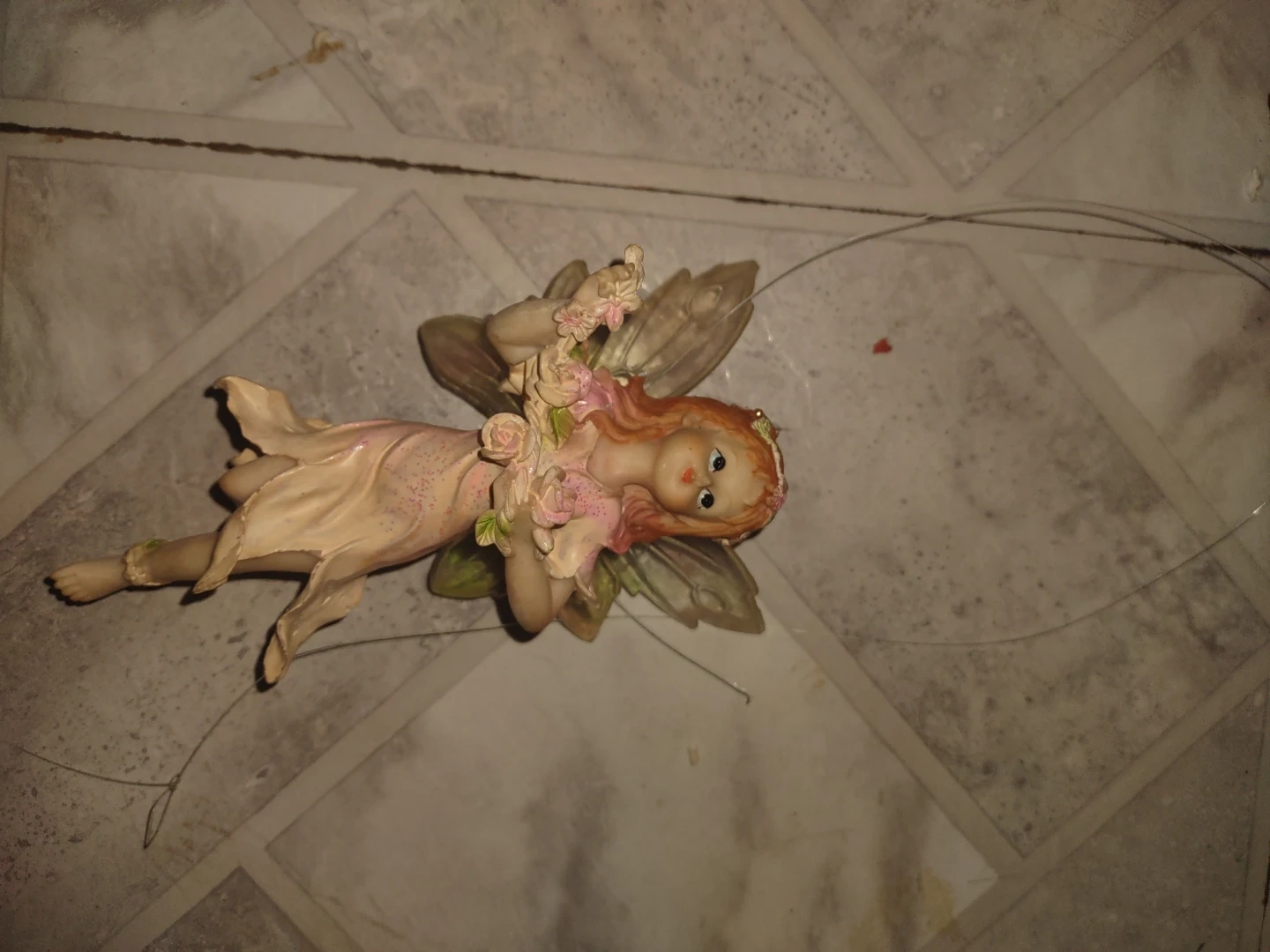Decorative fairy figurine wearing a pink dress and holding a bouquet of pink roses. Wings are translucent and iridescent. It's a lovely piece for display.(She also looks like she's flying once she's hung up)