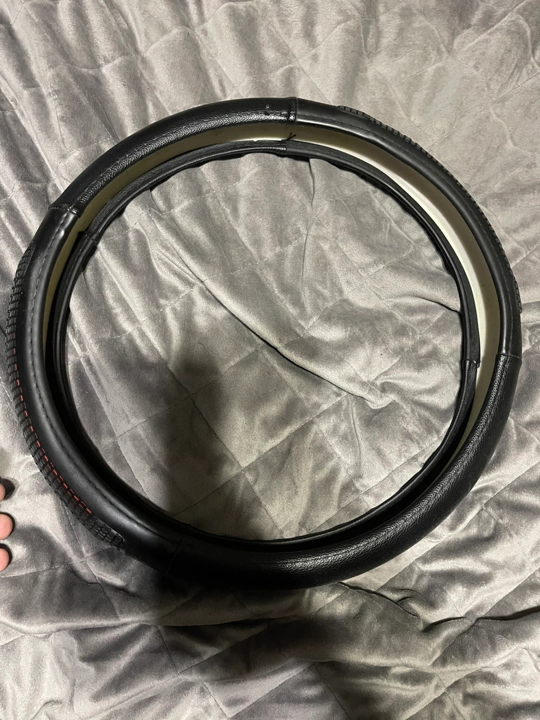 This steering wheel cover is made from a durable black material with a textured grip and red accent details. It fits most standard steering wheels for enhanced comfort and style. Easy to install!