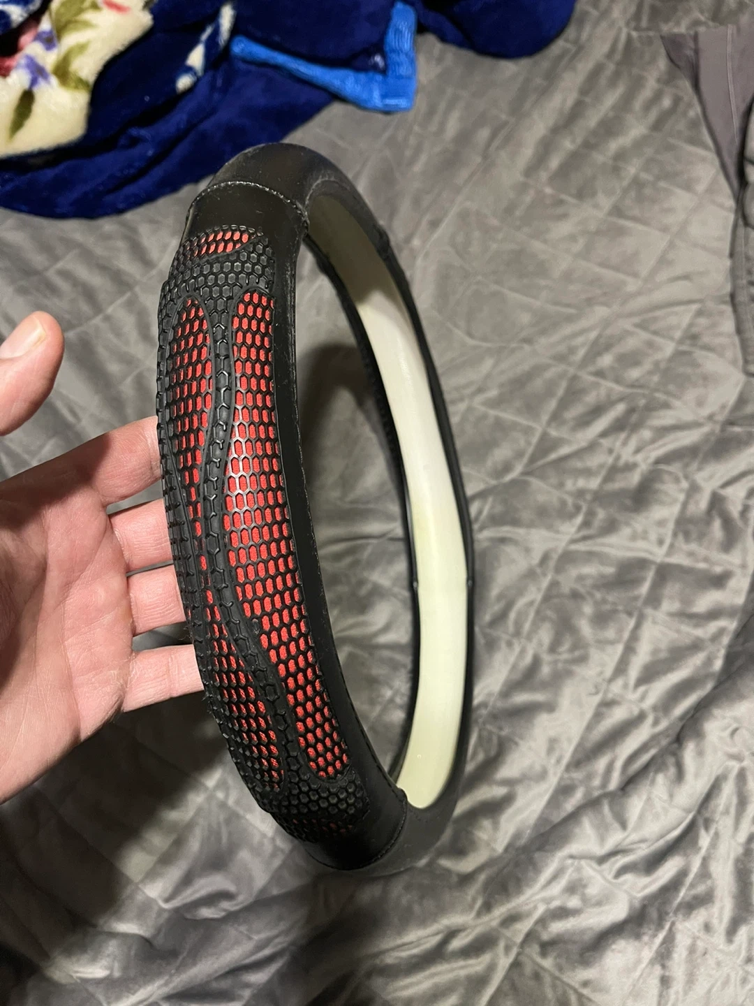 This steering wheel cover is made from a durable black material with a textured grip and red accent details. It fits most standard steering wheels for enhanced comfort and style. Easy to install!