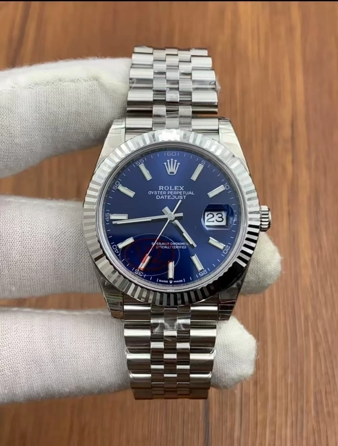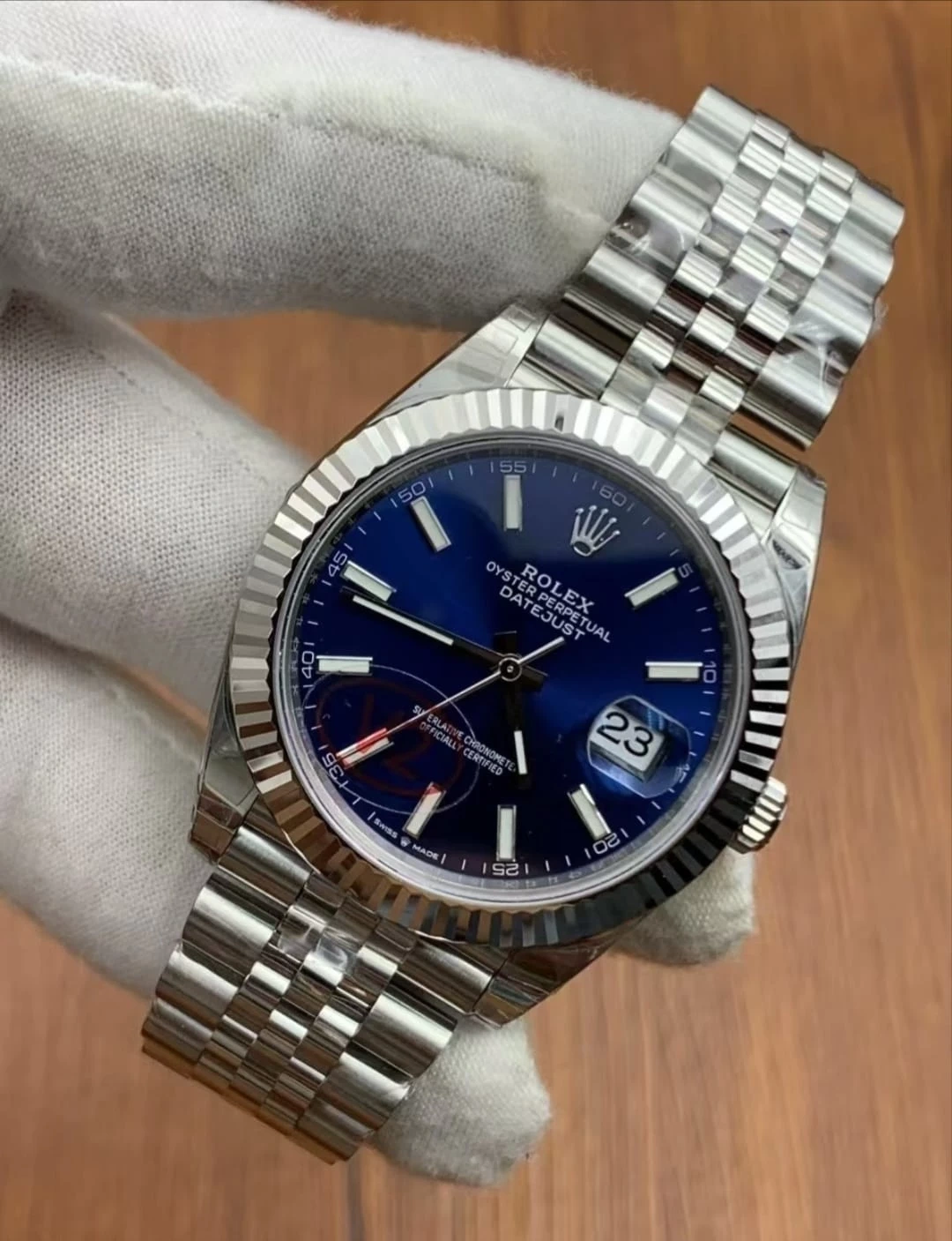 This is a Rolex Oyster Perpetual Datejust watch with a blue dial. It's made of stainless steel and features a fluted bezel. The watch comes with its original box and international guarantee card.